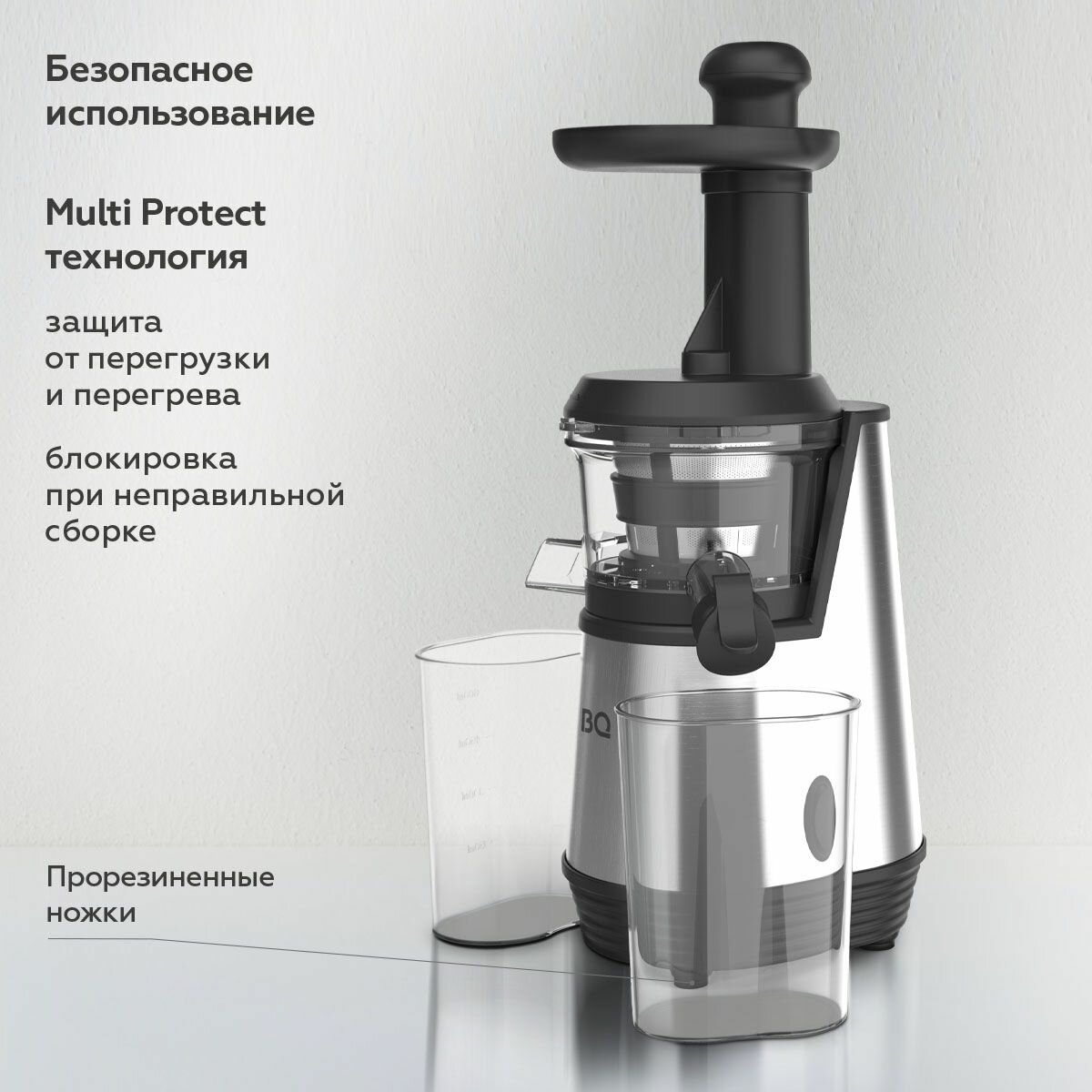 Соковыжималка шнековая BQ J2004 Черно-серебристая. Мощность 200Вт. Скорость работы до 70 об/мин