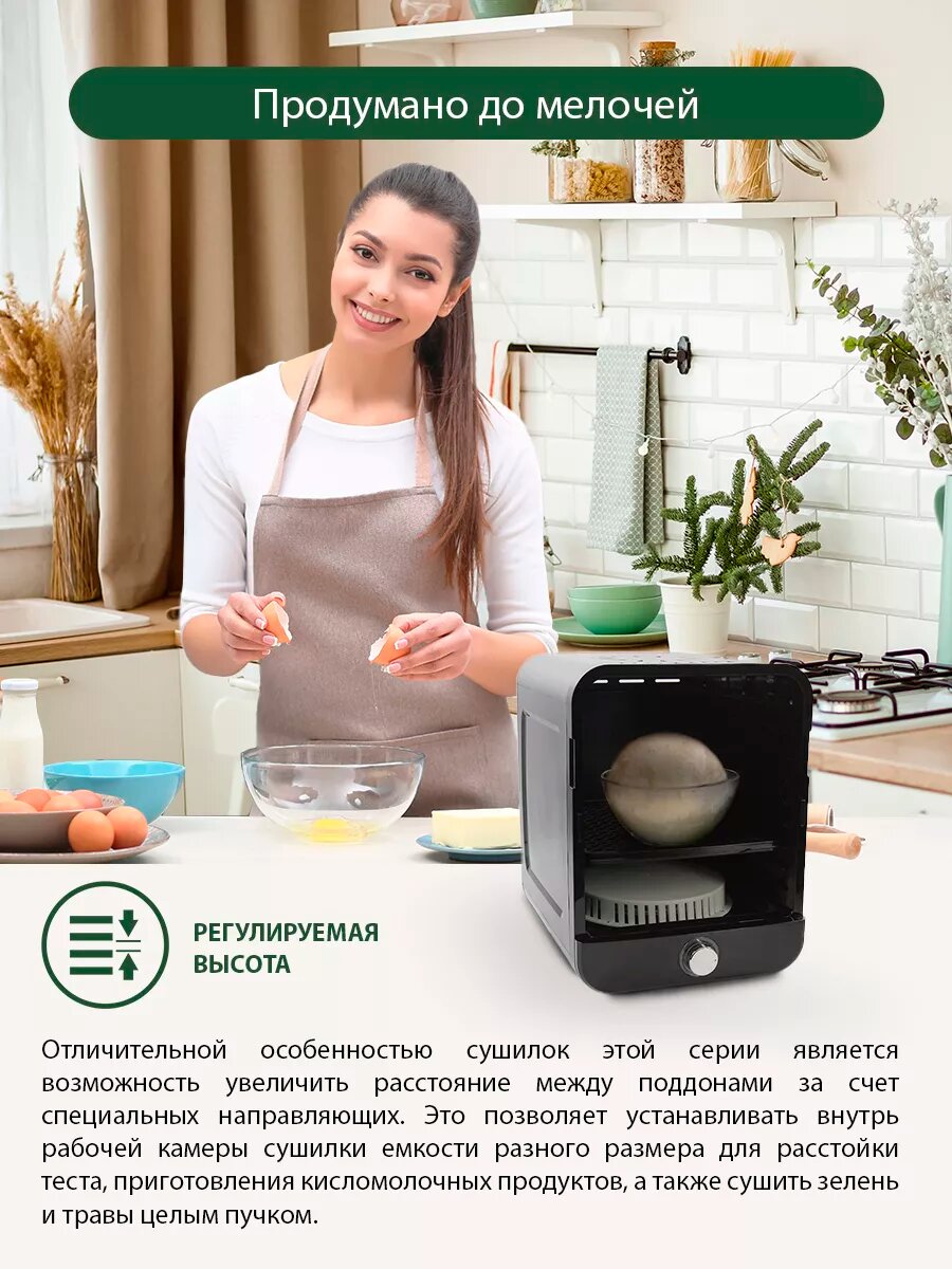 | Минусы: | Нужно протирать и проветривать первое время от запаха пластика. Для более быстрой и равномерной сушки следует часто переставлять лотки. |