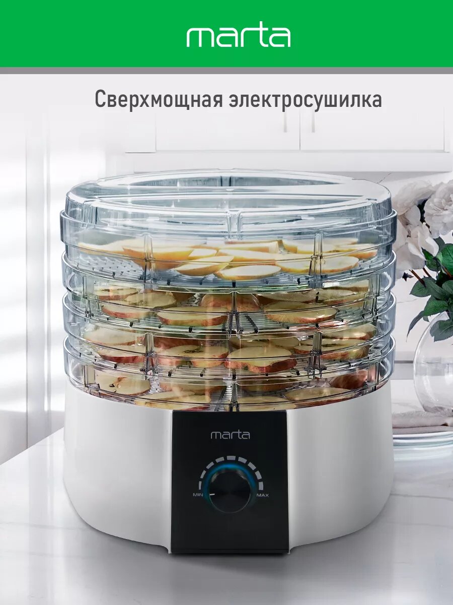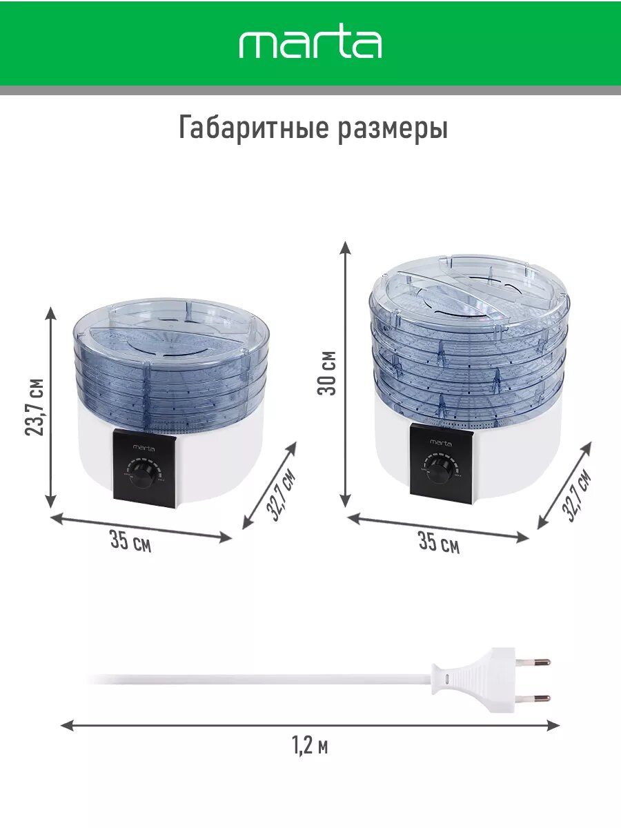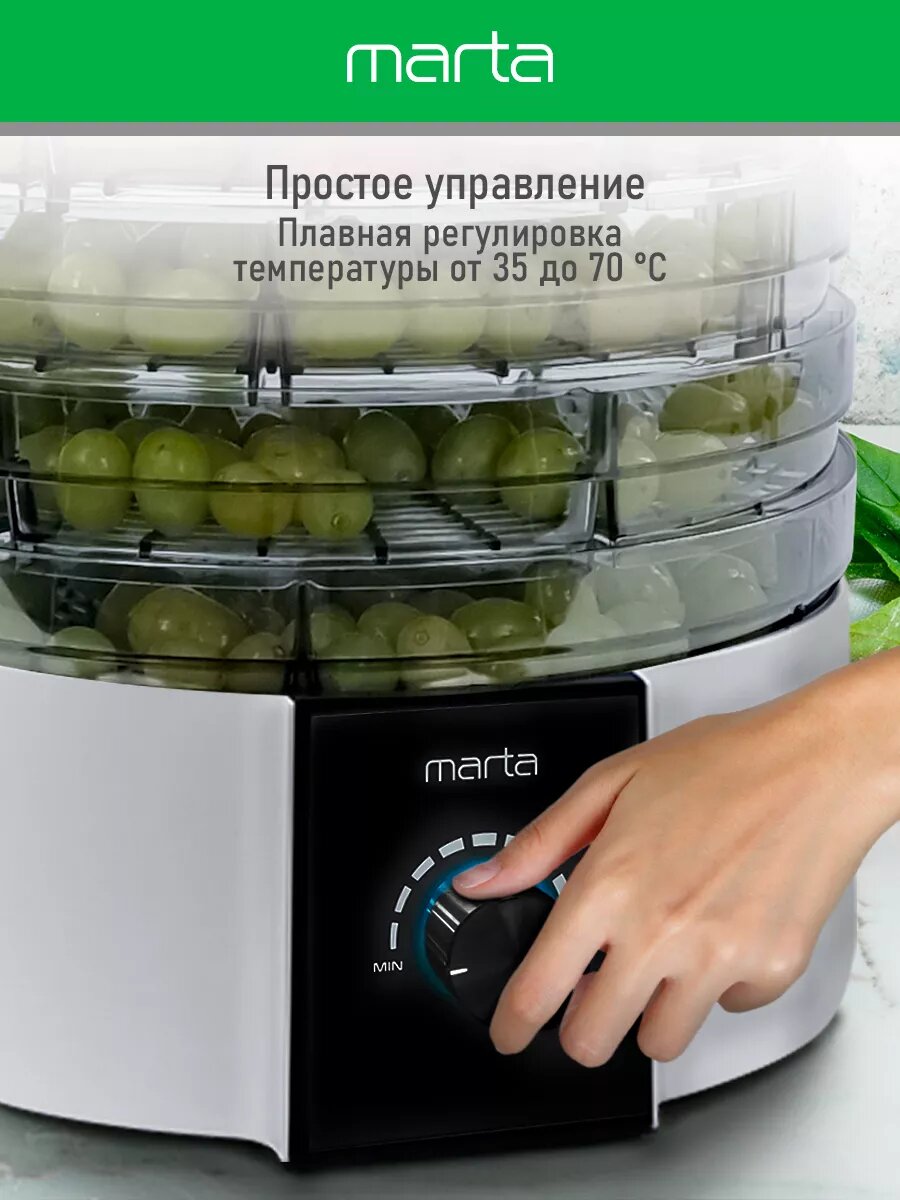 Купила сушилку Marta в начале лета. Неплохая вещь, удобная, вишни и грибы сушили, справилась быстро, и качество хорошее. Пяти поддонов хватает, можно за один раз много всего переработать. Управляется легко, температуру можно регулировать, выглядит приятно. Отмывается без особого труда. Мощности бы побольше. Шнур хорошей длины. Гарантии год дают.