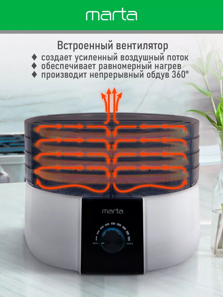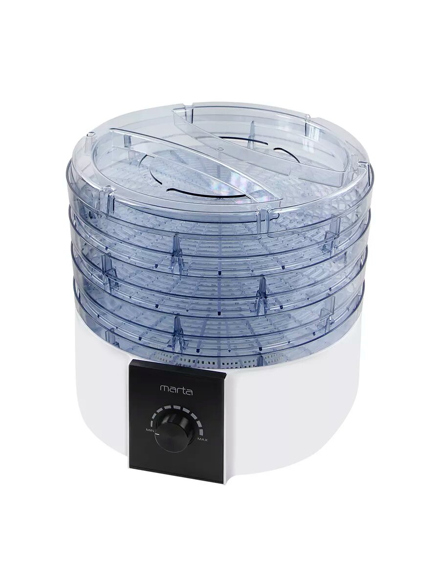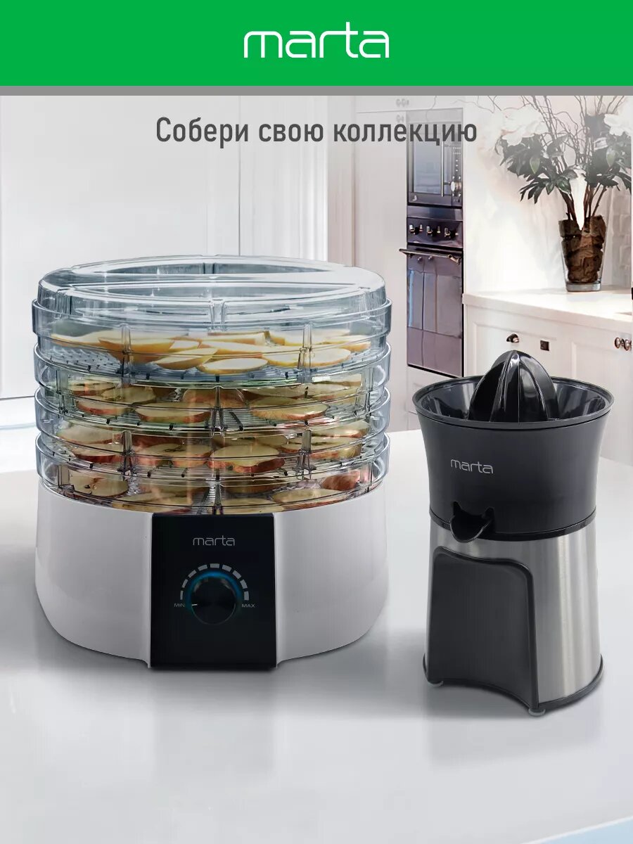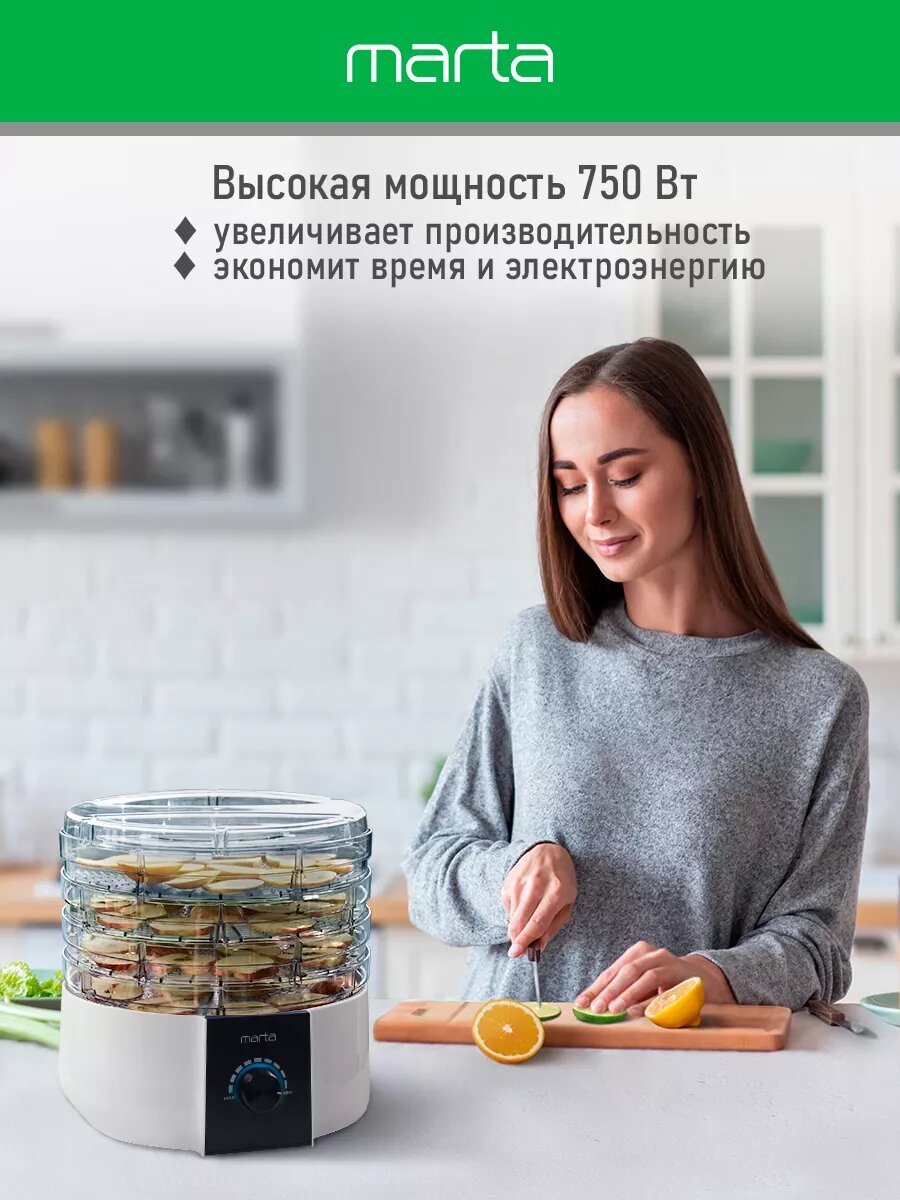 Купила сушилку Marta в начале лета. Неплохая вещь, удобная, вишни и грибы сушили, справилась быстро, и качество хорошее. Пяти поддонов хватает, можно за один раз много всего переработать. Управляется легко, температуру можно регулировать, выглядит приятно. Отмывается без особого труда. Мощности бы побольше. Шнур хорошей длины. Гарантии год дают.