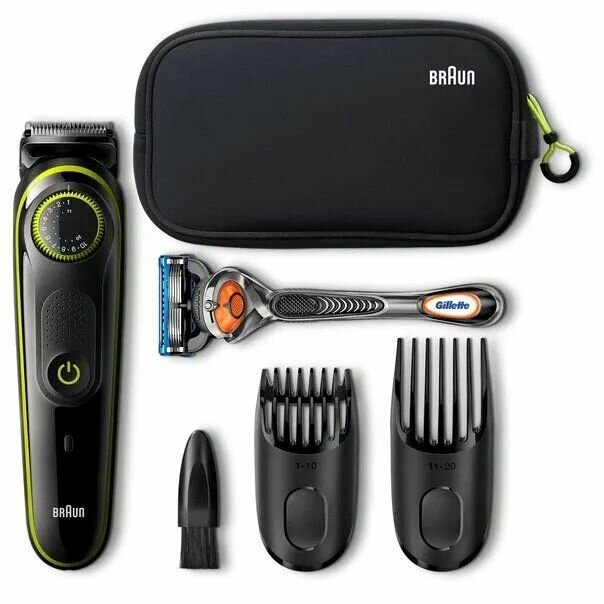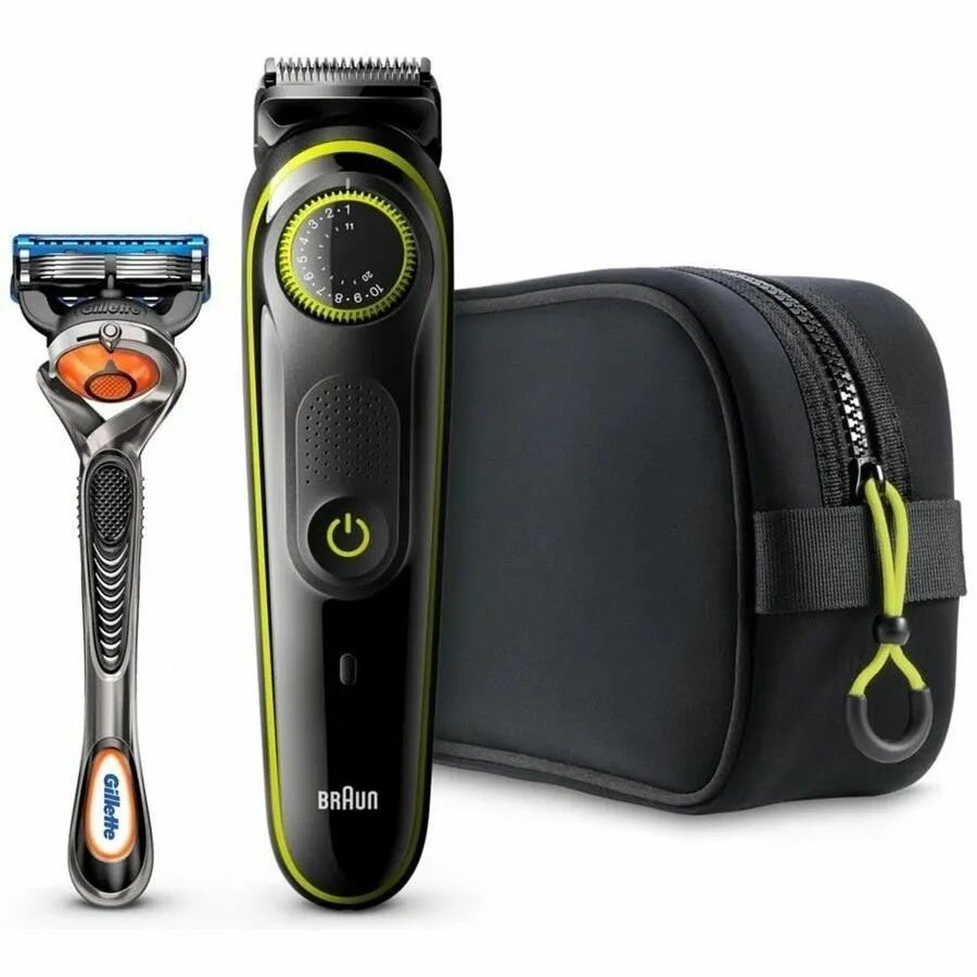 Триммер для бороды и усов Braun BT3941, интервал настройки 0.5 мм, бритва Gillette и дорожный чехол в комплекте, черный/зеленый