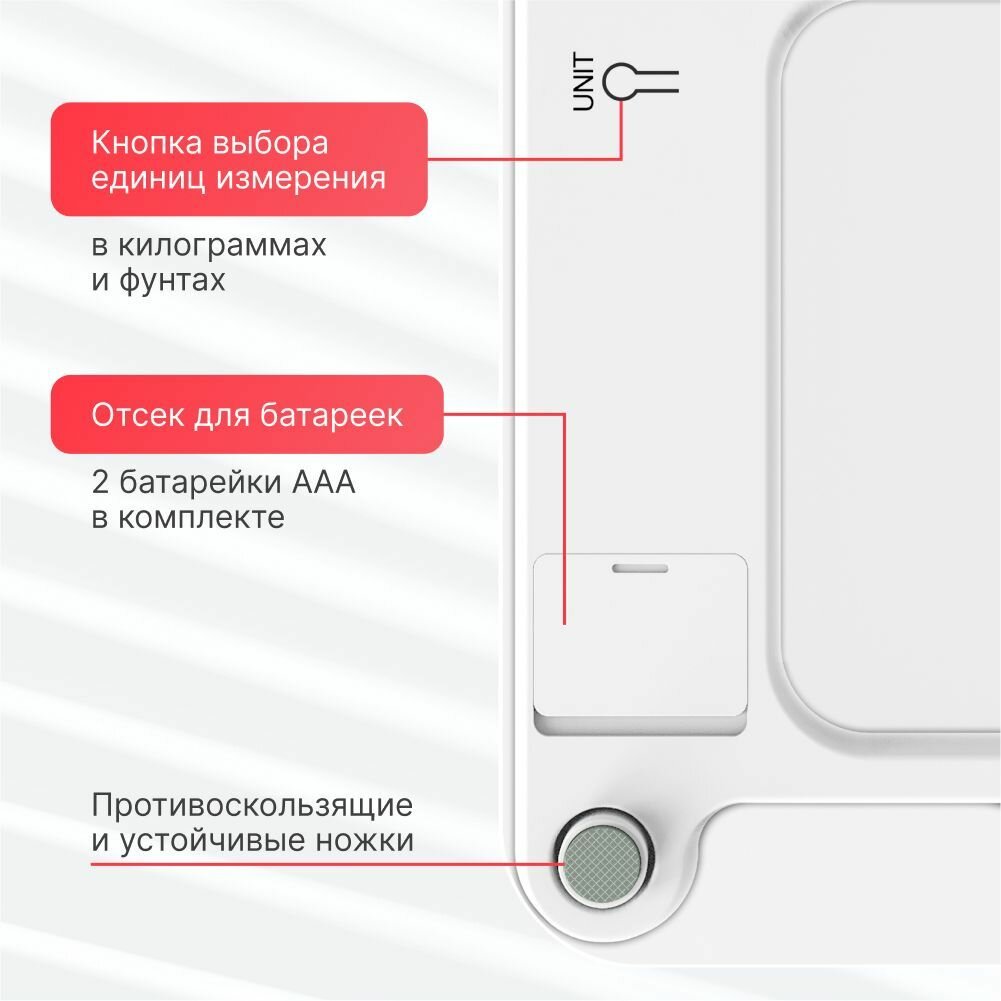 | Дополнительная информация | Прочные нескользящие ножки,высокочувствительные датчики, синхронизация данных через Bluetooth или Wi-Fi с мобильным приложением,анализ состава тела,персонализированные графики изменения параметров тела (в приложении),постановка целей,неограниченное количество пользователей,поддержка синхронизации с фитнес-приложениями (Samsung Health, Fitbit, Google Fit и Apple Health) |