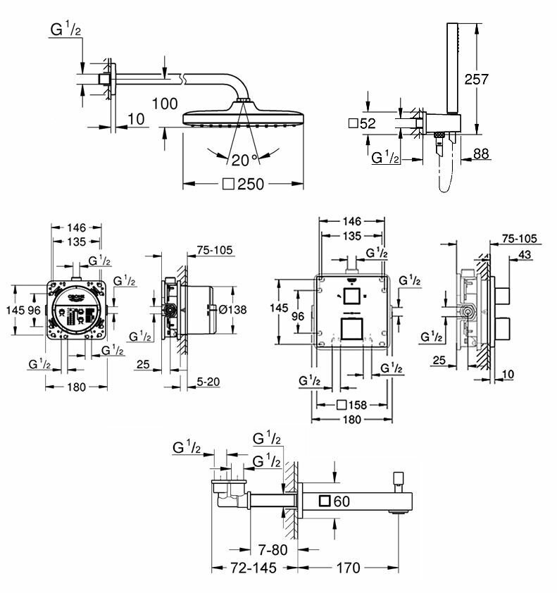 Душевая система с тропическим душем, термостатом и изливом Grohe Grohtherm Professional 250 Cube Spout, Германия интересное: