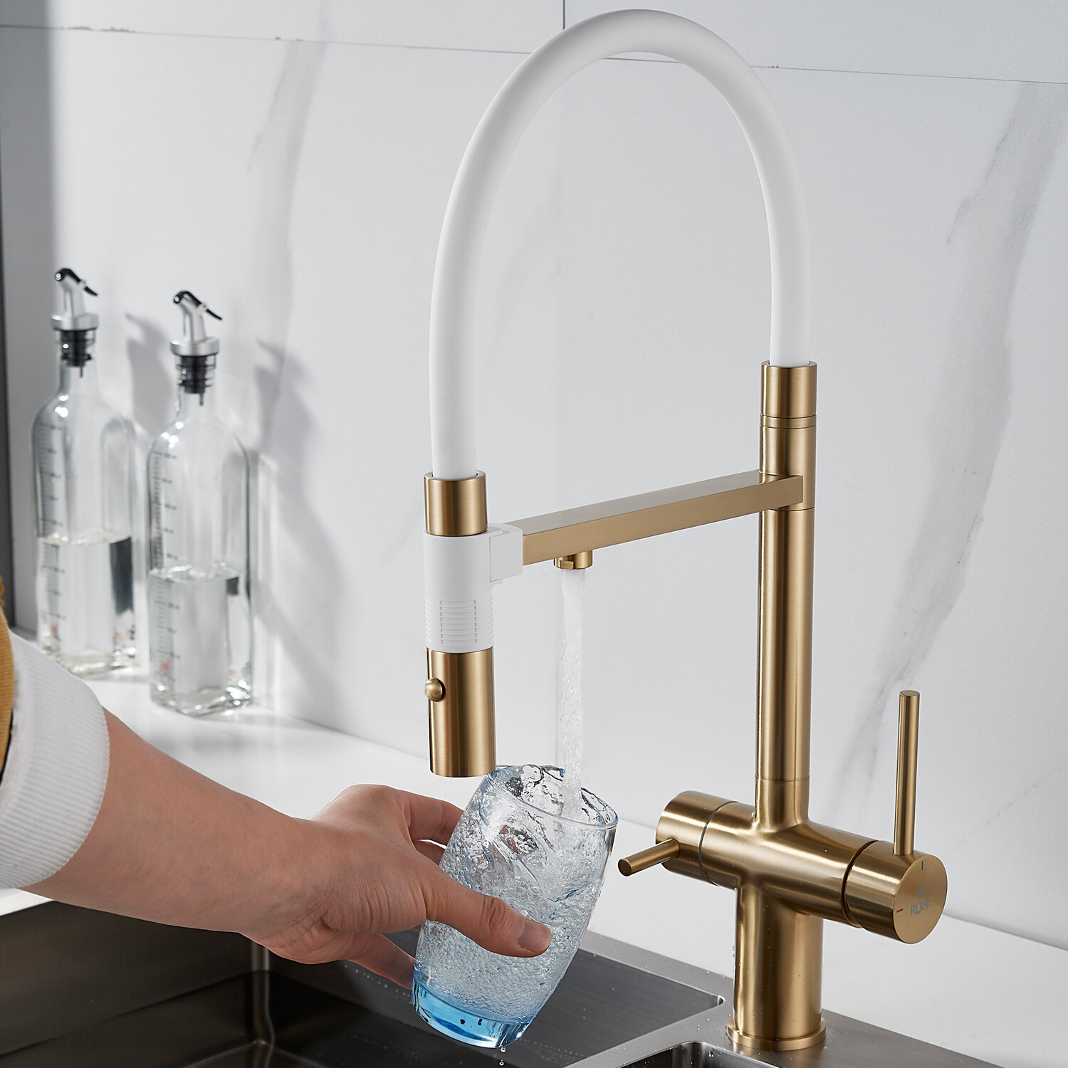 Смеситель для кухни с гибким изливом и подключением фильтра Rose R958G золотой сатин