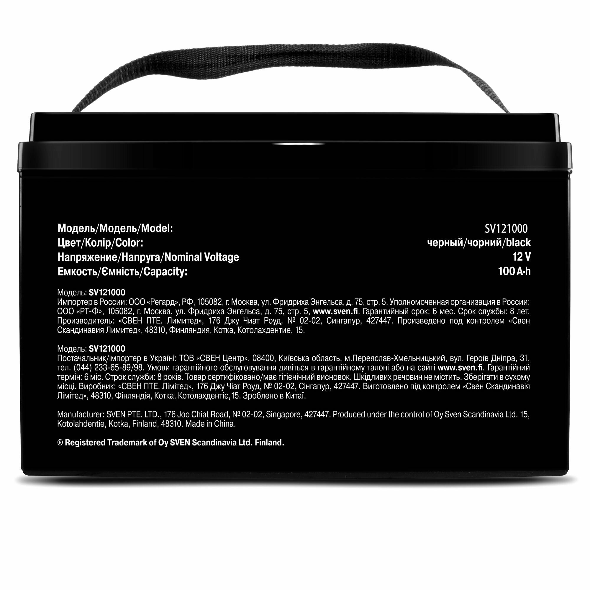 Батарея Sven Battery SV 121000 (12V 100Ah), 12V voltage, 100A*h capacity, max. discharging rate of 1000A, max. charging rate 30A, the type of интересное: