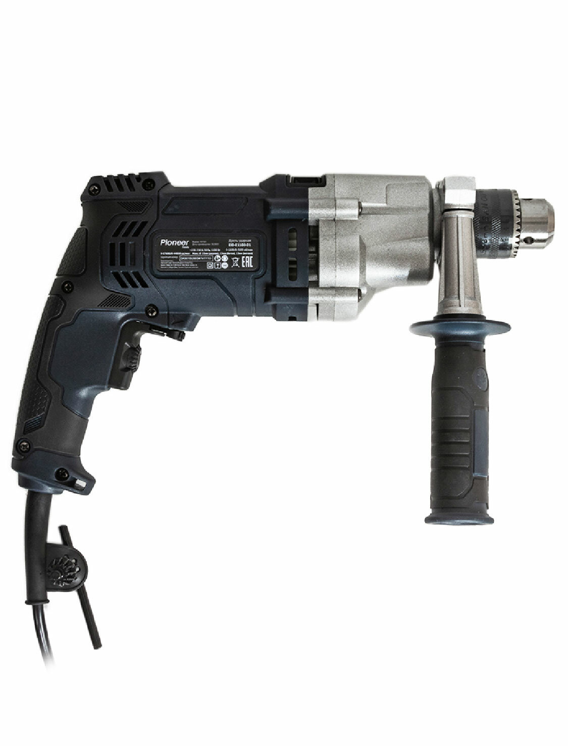 Электродрель ударная Pioneer EID-E1100-01 с щеточным двигателем, 2 режима работы, 2 скорости и реверс, ключевой патрон, рукоятка Anti-Slip+доп. рукоятка, 1100 Вт