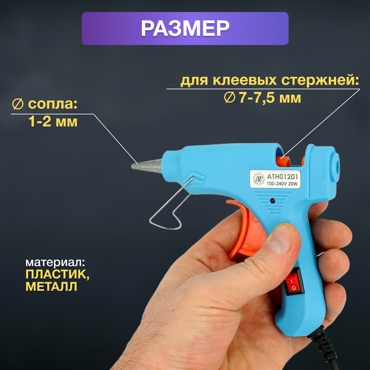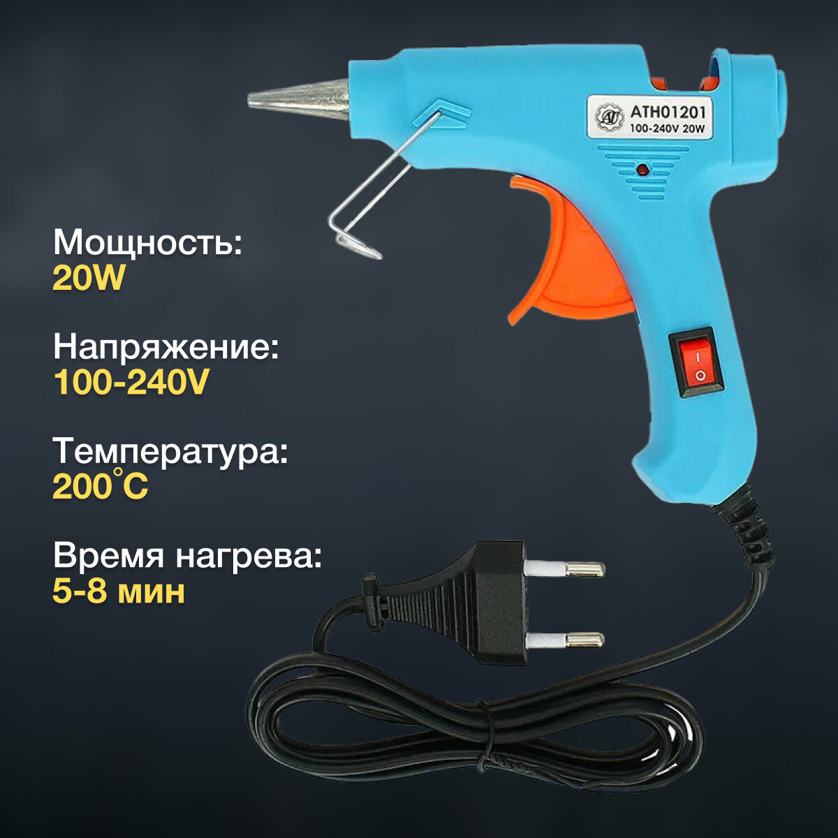 Клеевой пистолет 7мм 20W с выключателем голубого цвета / Термопистолет для рукоделия интересное: