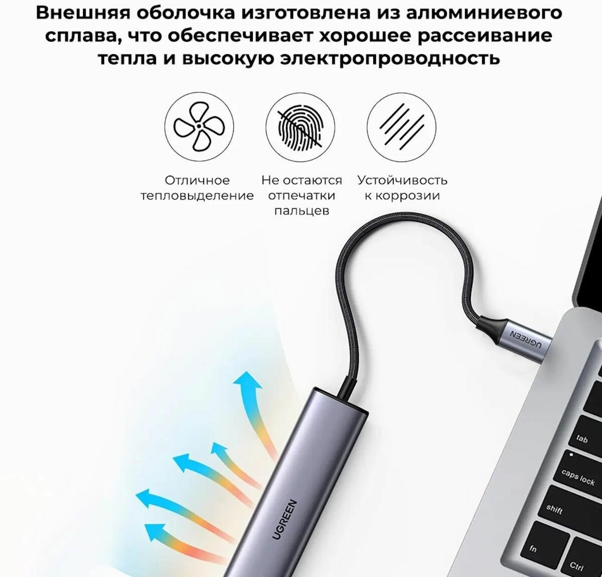 СохранитьМульти Хаб UGREEN CM475 (60600) USB-C to 3×USB3.0 Hub+RJ45 Ethernet Adapter без порта питания серый интересное: