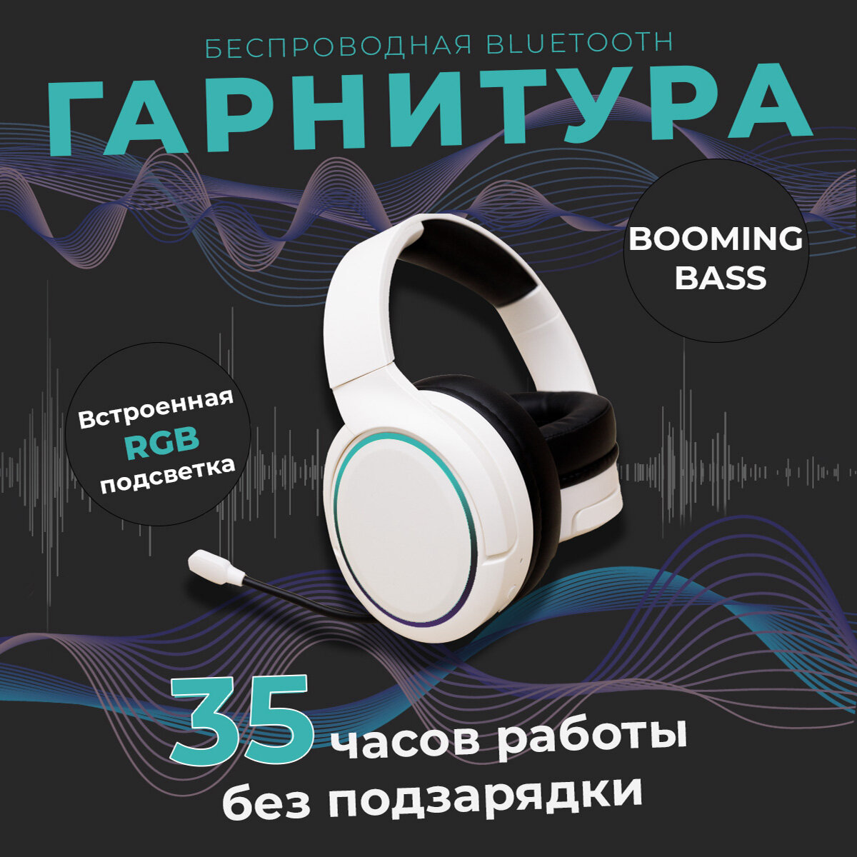 Купить Наушники беспроводные, с микрофоном, RGB подсветкой, блютуз гарнитура, белый