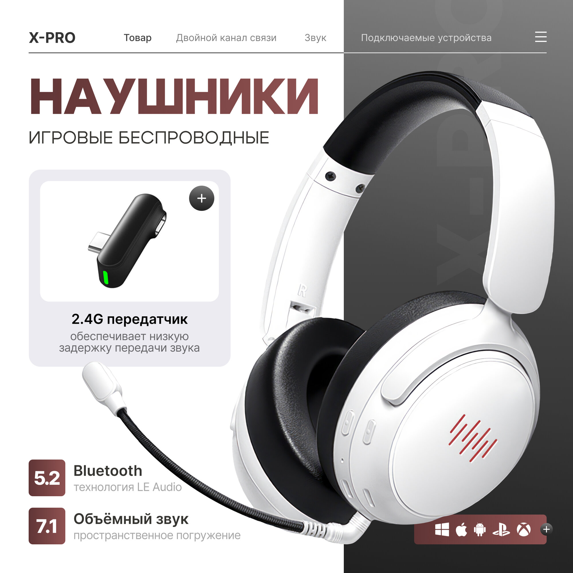 Купить Наушники игровые беспроводные 7.1 с микрофоном и 2.4G передатчиком для телефона, ПК, ноутбука, PS4/PS5, белые