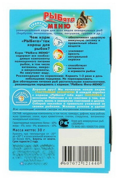 СохранитьКорм РЫБята `Меню` корм для рыб гранулы универсальные, коробка + сюрприз, 30 гр., 20 шт. (2 упаковки) интересное: