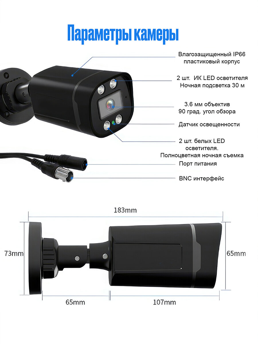 | Подробная комплектация | 1 х USB мышь;1 x 8-канальный AHD видеорегистратор; 4 x AHD камеры 5Mp; 1 x источник питания со сплиттером для 4х камер; 1 x источник питания для DVR; 4 x BNC кабель 18 м для камеры; 1 x HDMI кабель;4 x Монтажный комплект для камер; Документация и упаковка. |