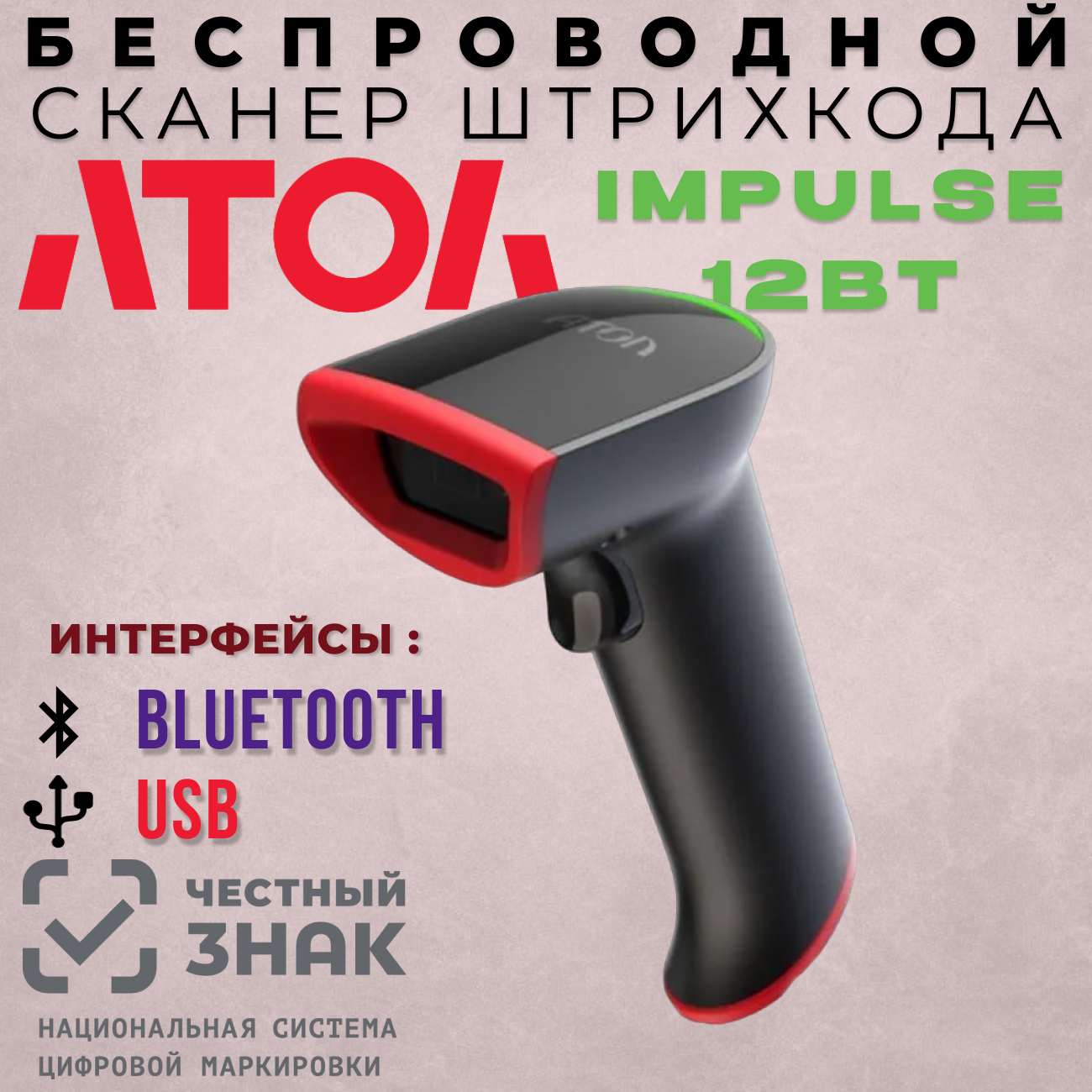 Сканер штрихкода Атол беспроводной Impulse 12 BT (2D, чёрный, Bluetooth, без подставки, упаковка 1 шт.) (Bluetooth).V2 интересное:
