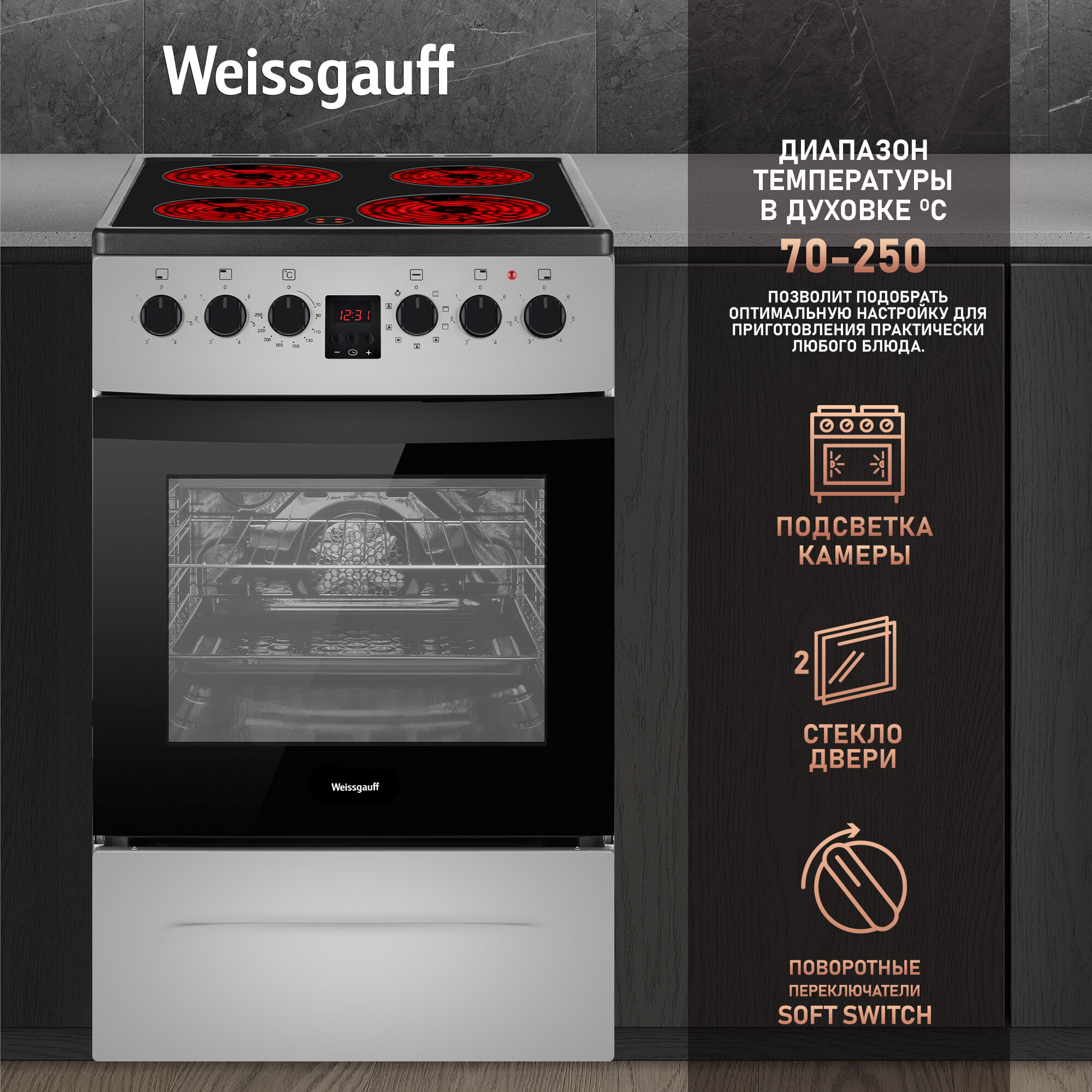 Электрическая плита Weissgauff WES 2V16 SE 3 года гарантии, Объем 50 литров, гриль, Конвекция, Термостат духового шкафа интересное: