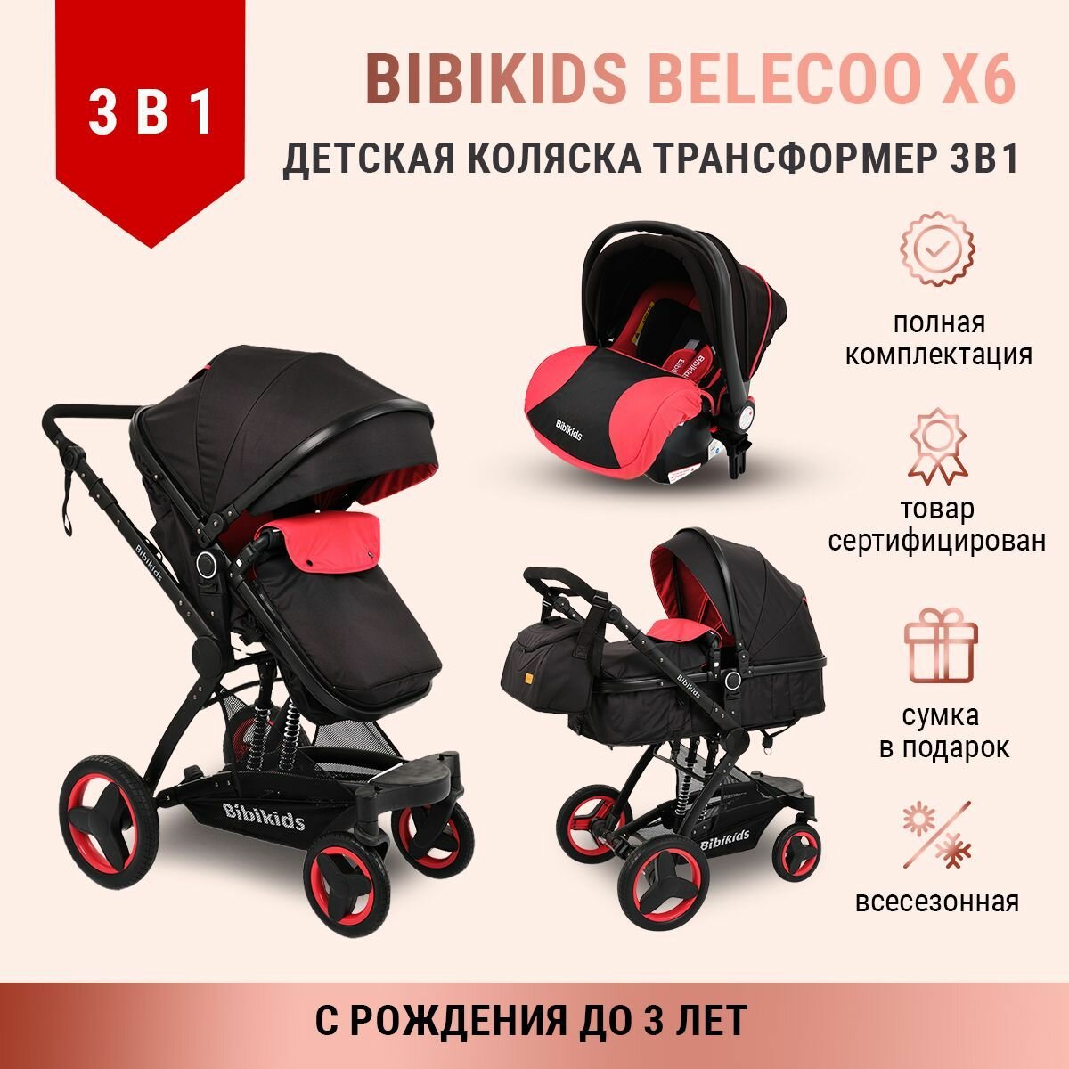 Купить Детская коляска 3 в 1 трансформер Bibikids Belecoo X6 люлька новорожденных прогулочная автокресло
