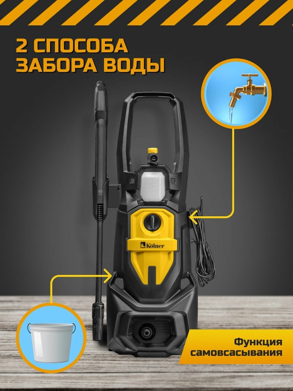 Мойка высокого давления Kolner K170 LUX для автомобиля, автомойка длина шланга 8 м, мощность 2500 Вт, электрическая 220 В, всасывание воды 450 л/ч, черный и желтый