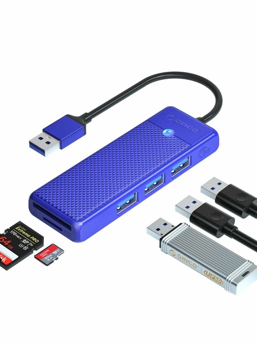 Концентратор ORICO USB-A с 3x USB-A, слотом для SD и Micro SD синий (ORICO-PAPW3AT-U3-015-BL-EP)