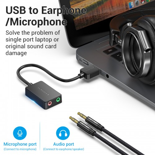 Vention Внешняя звуковая карта на 2 порта Jack 3,5 для наушников, микрофона, компьютера, адаптер USB 2.0, арт. CDYB0
