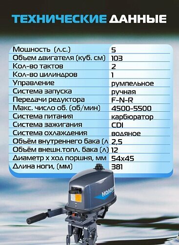 | Особенности | аварийный выключатель двигателя, наклон румпеля, передвижение по мелководью, регулировка угла наклона мотора, электронная система зажигания |