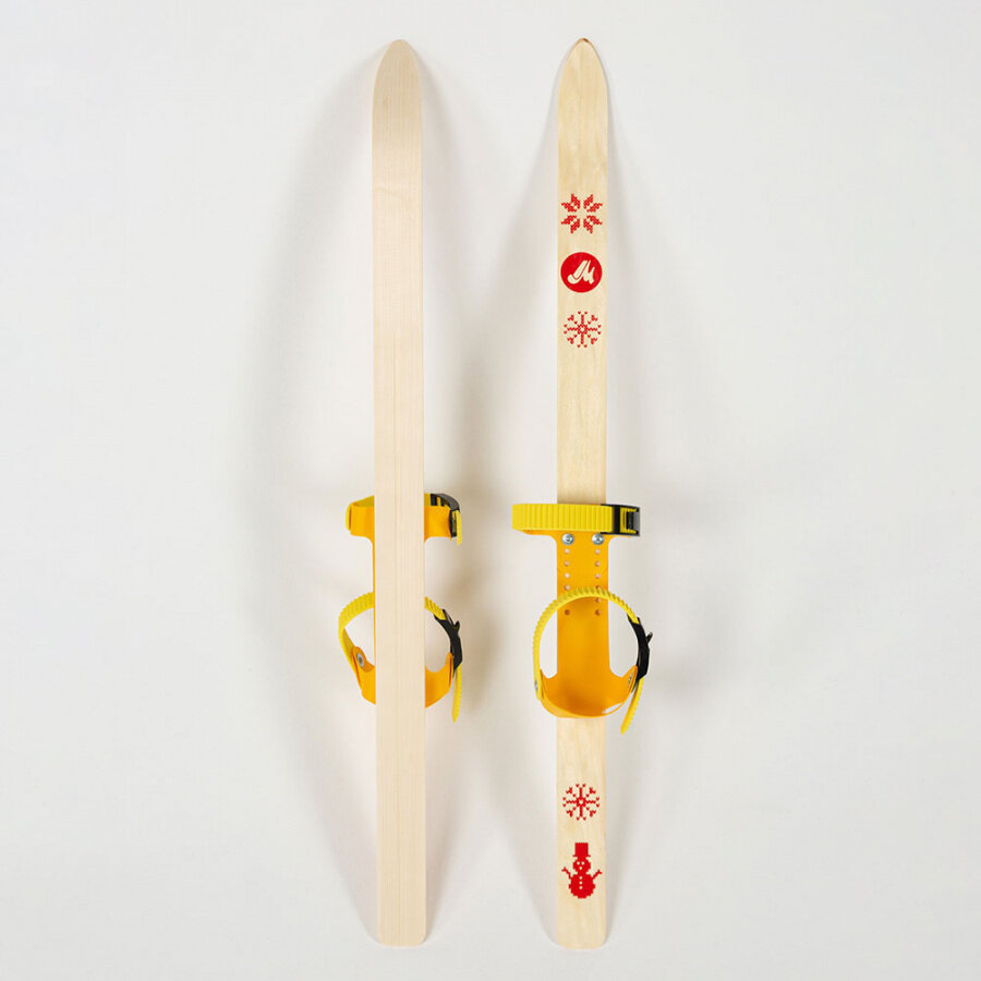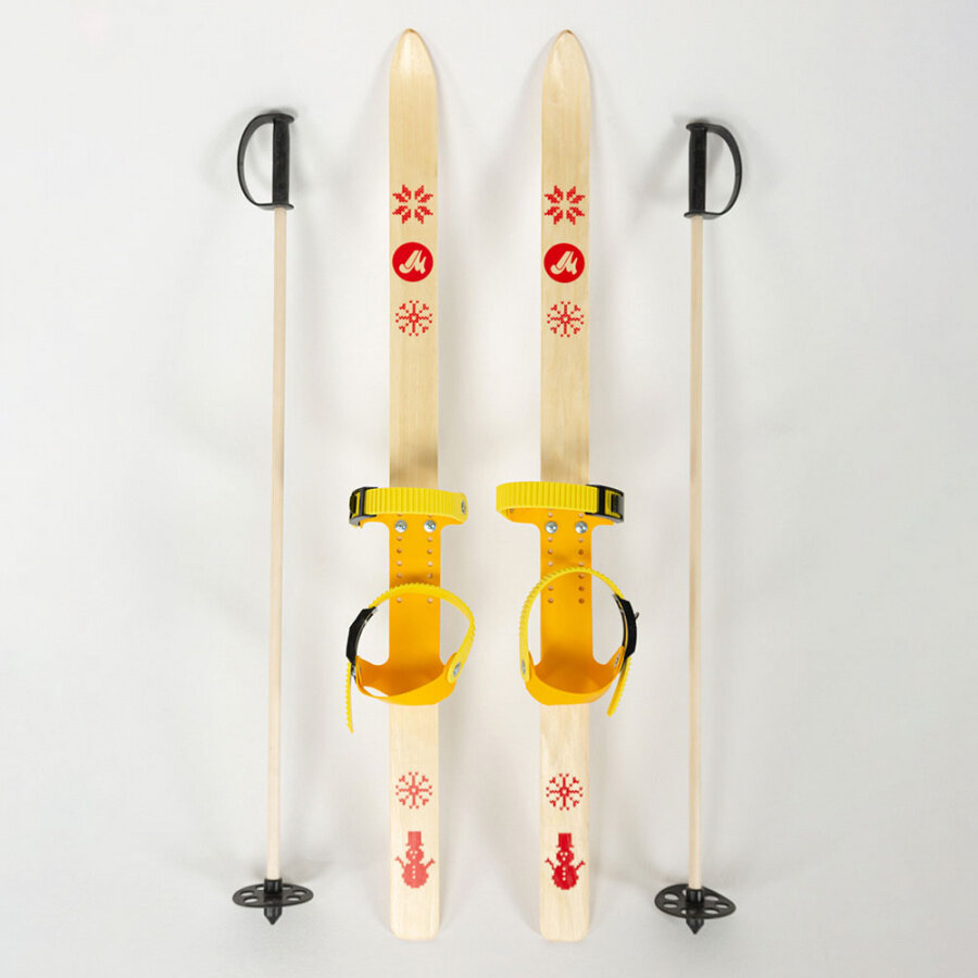 Купить Лыжи детские Маяк Junior 90 см с креплениями и палками, деревянные, желтые