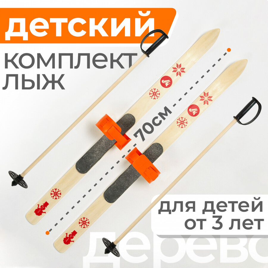 Купить Лыжи детские Маяк Baby 70 см с креплениями и палками, деревянные, оранжевые