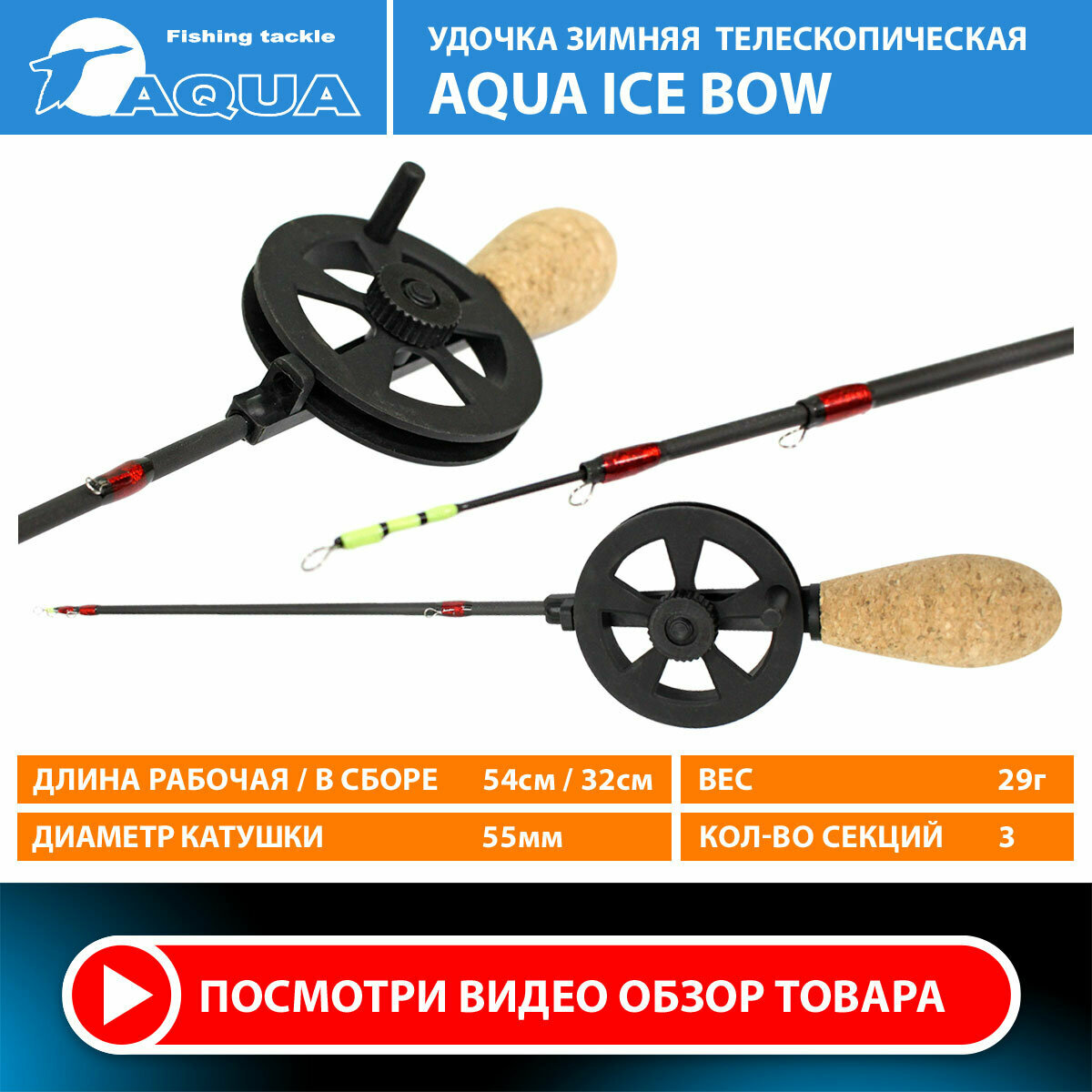 Удочка для зимней рыбалки AQUA ICE BOW телескопическая с катушкой и пробковой ручкой (зимняя удочка)