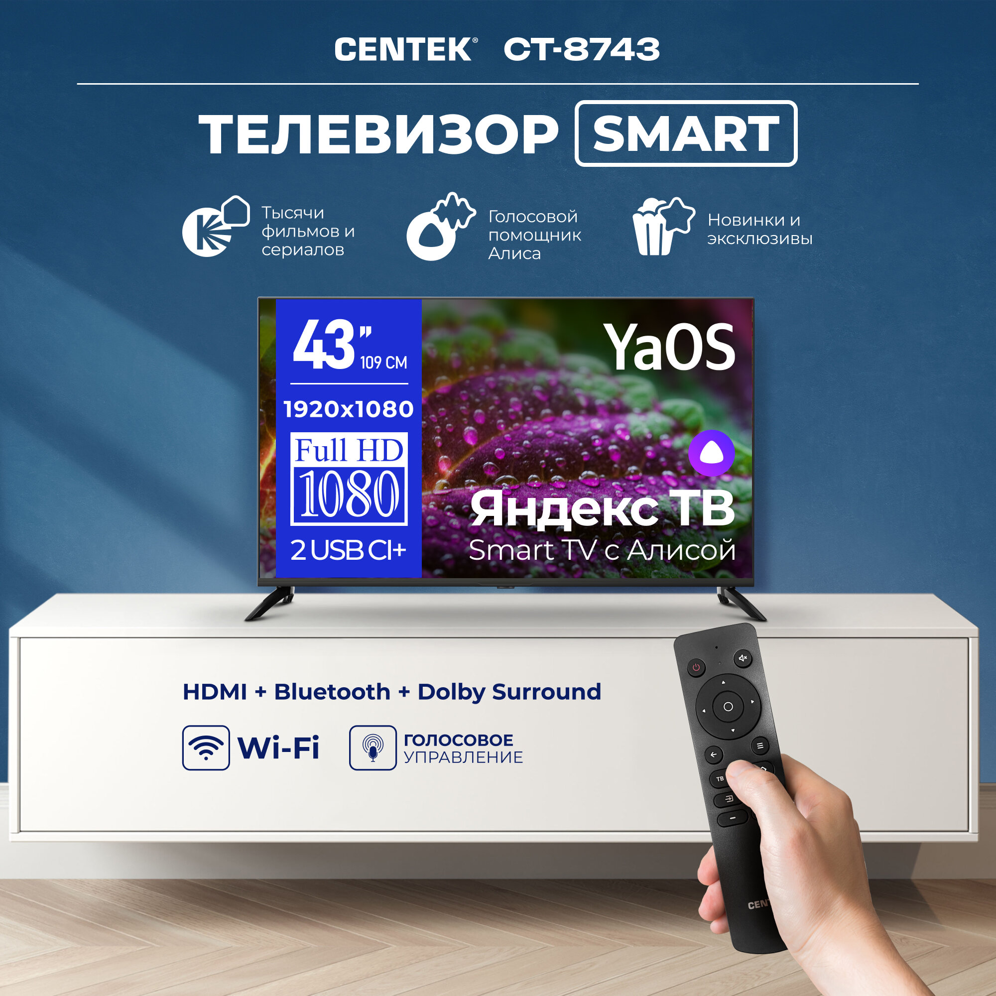 Телевизор CENTEK CT-8743: SMART,43 дюйма, FullHD, Wi-Fi, Bluetooth, HDMIx3, USBx2, DVB-T/T2 Яндекс YaOS интересное: