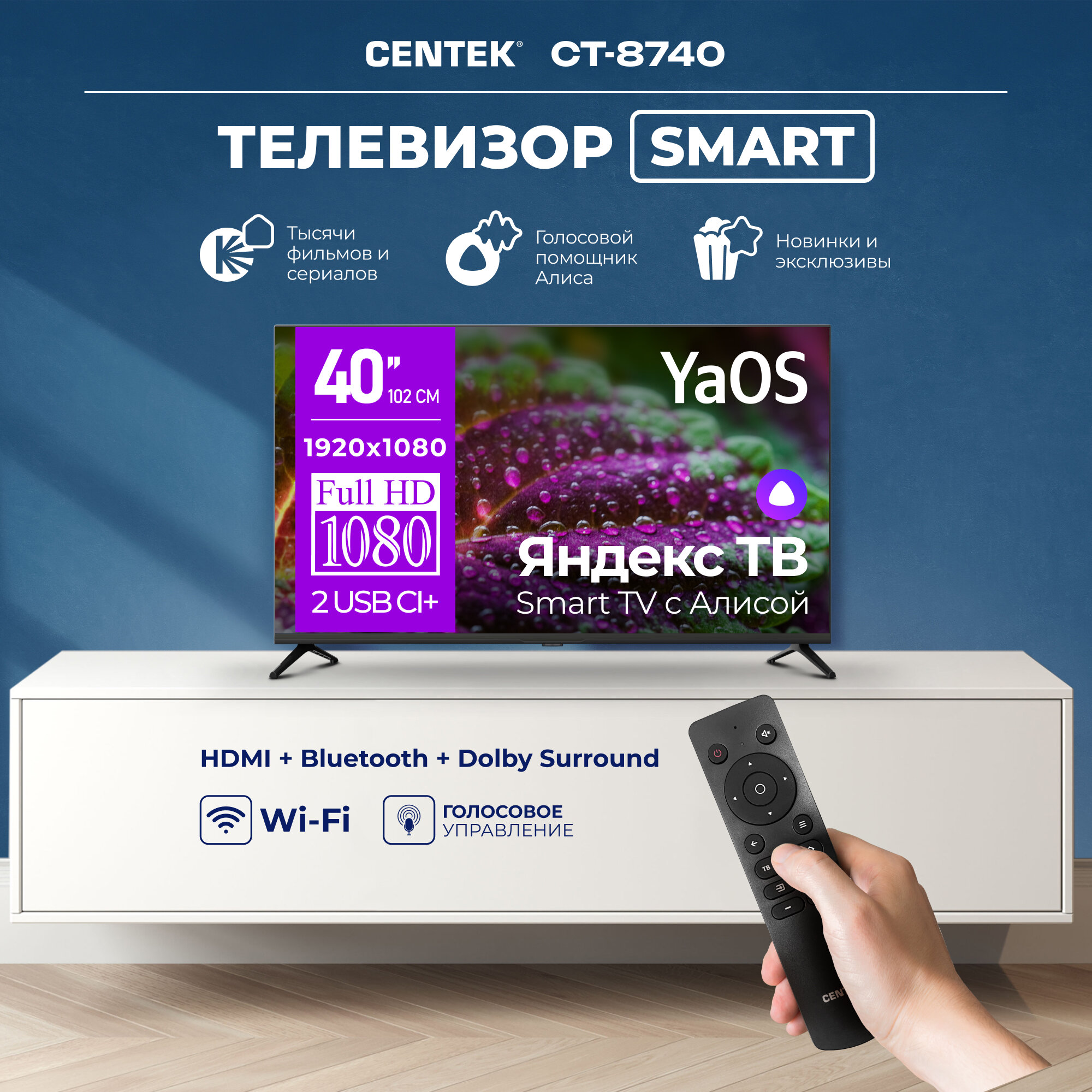 Телевизор Centek CT-8740 SMART, 40 дюймов, FullHD, Wi-Fi, Bluetooth, HDMIx3, USBx2, DVB-T/T2, Яндекс YaOS, Алиса