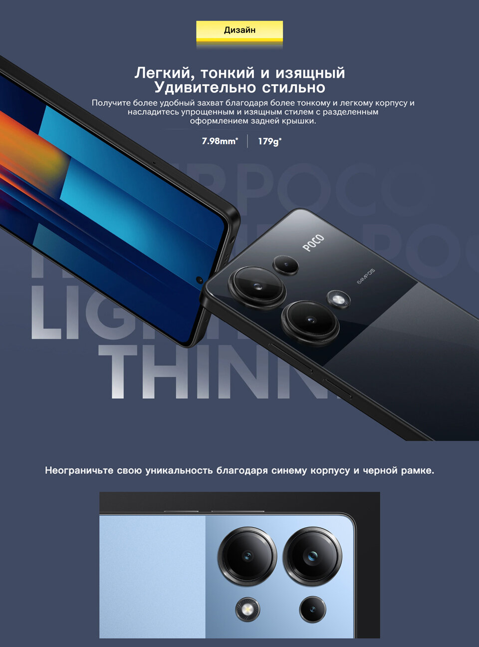 | Особенности | Poco M6 Pro получил современный дизайн: сдержанный / строгий / при этом привлекательный. Его углы немного закруглены / а боковые грани плоские. Клавиши практически не возвышаются над ними. |