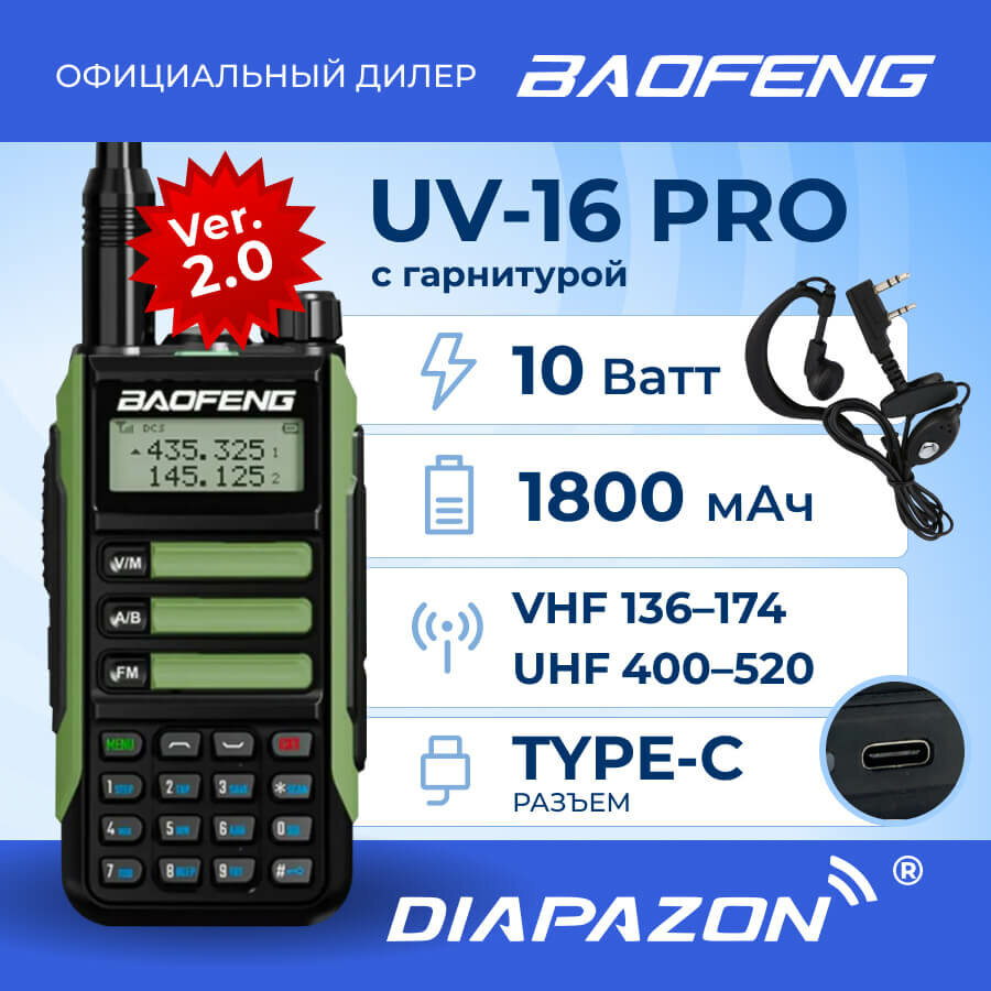 Рация BAOFENG UV-16 PRO Ver.2 10W Type-C с гарнитурой, цвет зеленый интересное: