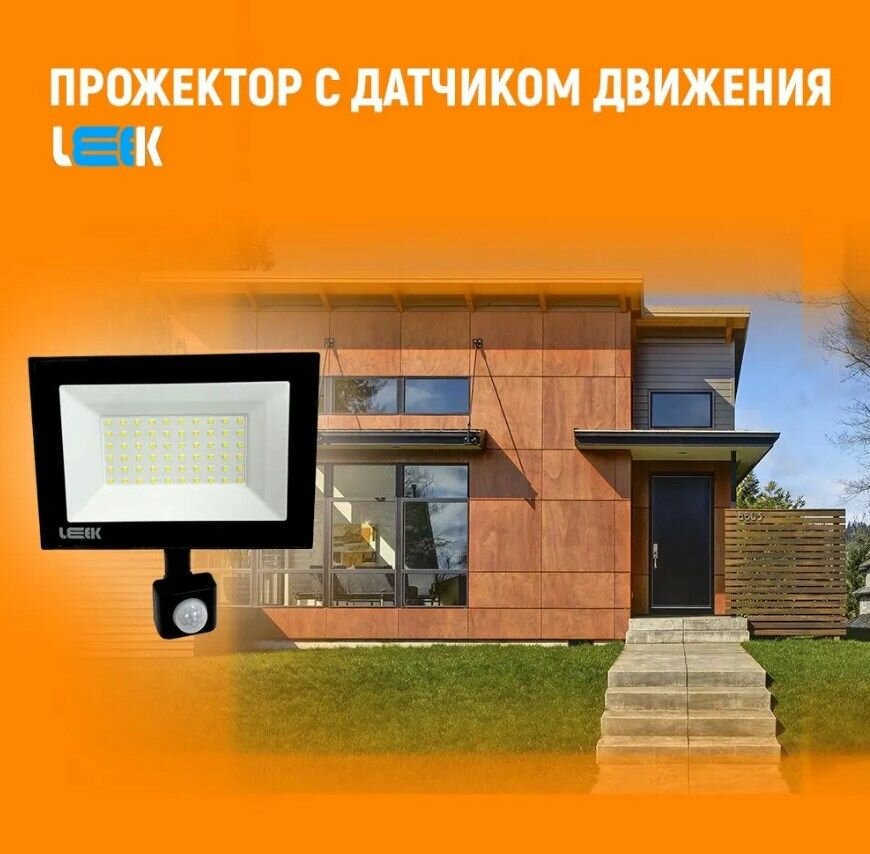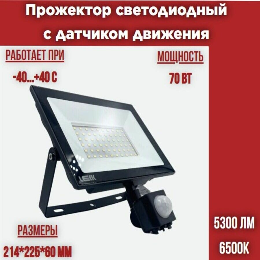 Прожектор светодиодный 70Вт с датчиком движения, IP65, для внутреннего и наружного освещения дворов, подъездов, охраняемых территорий, влагостойкий, LEEK