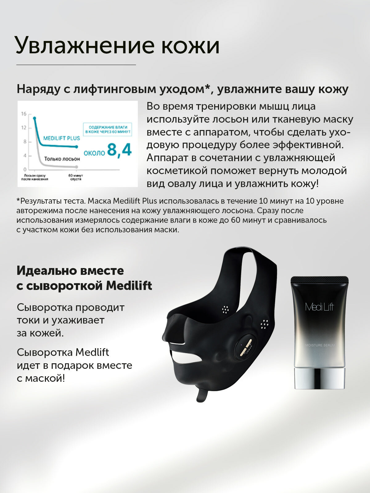 | Комплектность | Аппарат, USB-кабель для зарядки, коробка, инструкция на русском языке, сыворотка Medi Lift Moisture Serum |