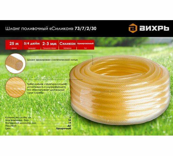 Шланг поливочный Вихрь "Силикон" трёхслойный армированный 3/4", 25м (прозрачный), 73/7/2/30 интересное: