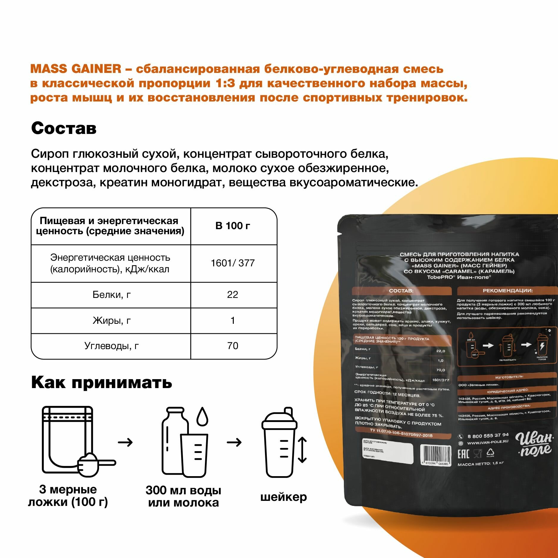 Купить Гейнер протеин высокобелковый Карамель MASS GAINER TobePRO, Иван-поле, 1,5 кг