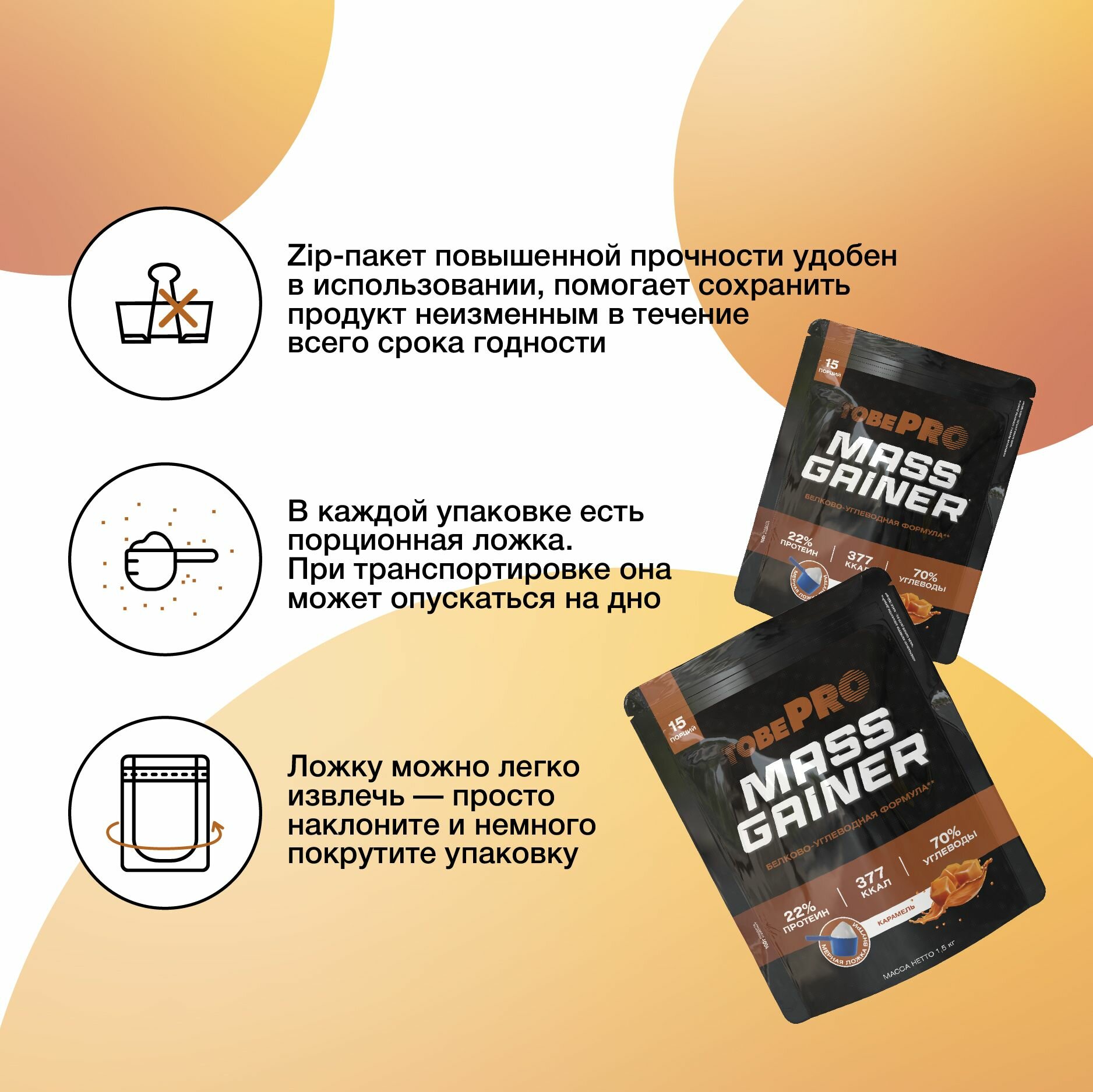 Гейнер TobePRO MASS GAINER для набора массы Карамель, 1,5 кг/15 порций