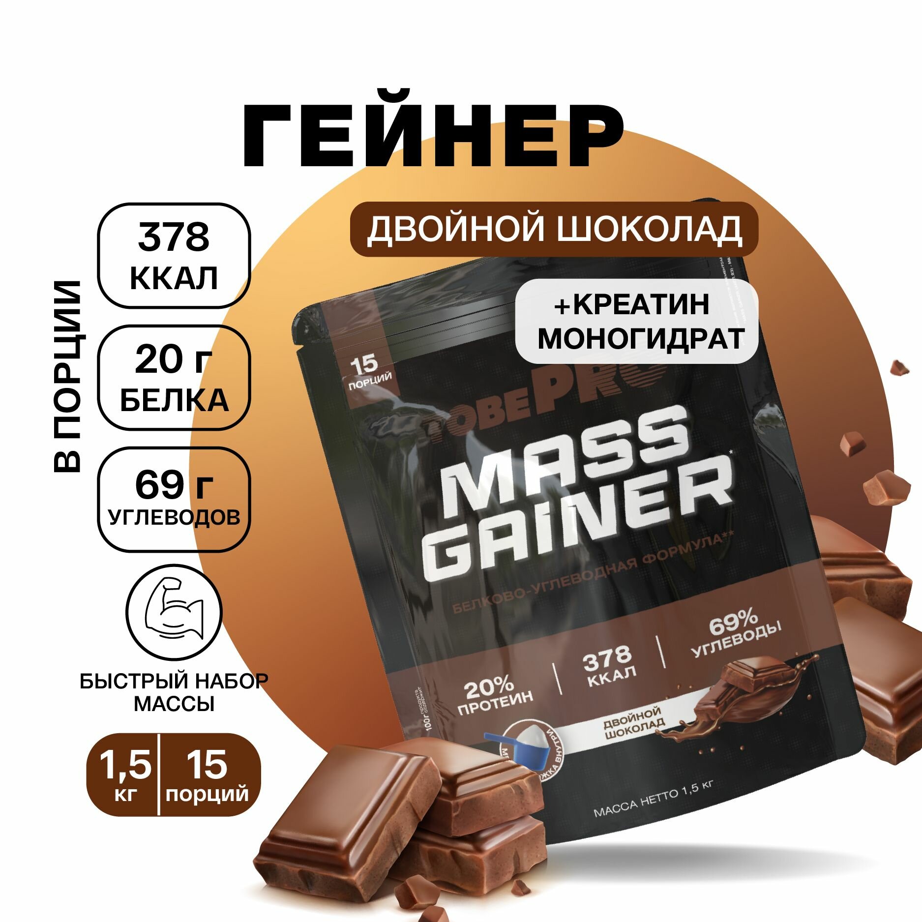 Гейнер TobePRO MASS GAINER для набора массы Двойной шоколад, 1,5 кг/15 порций