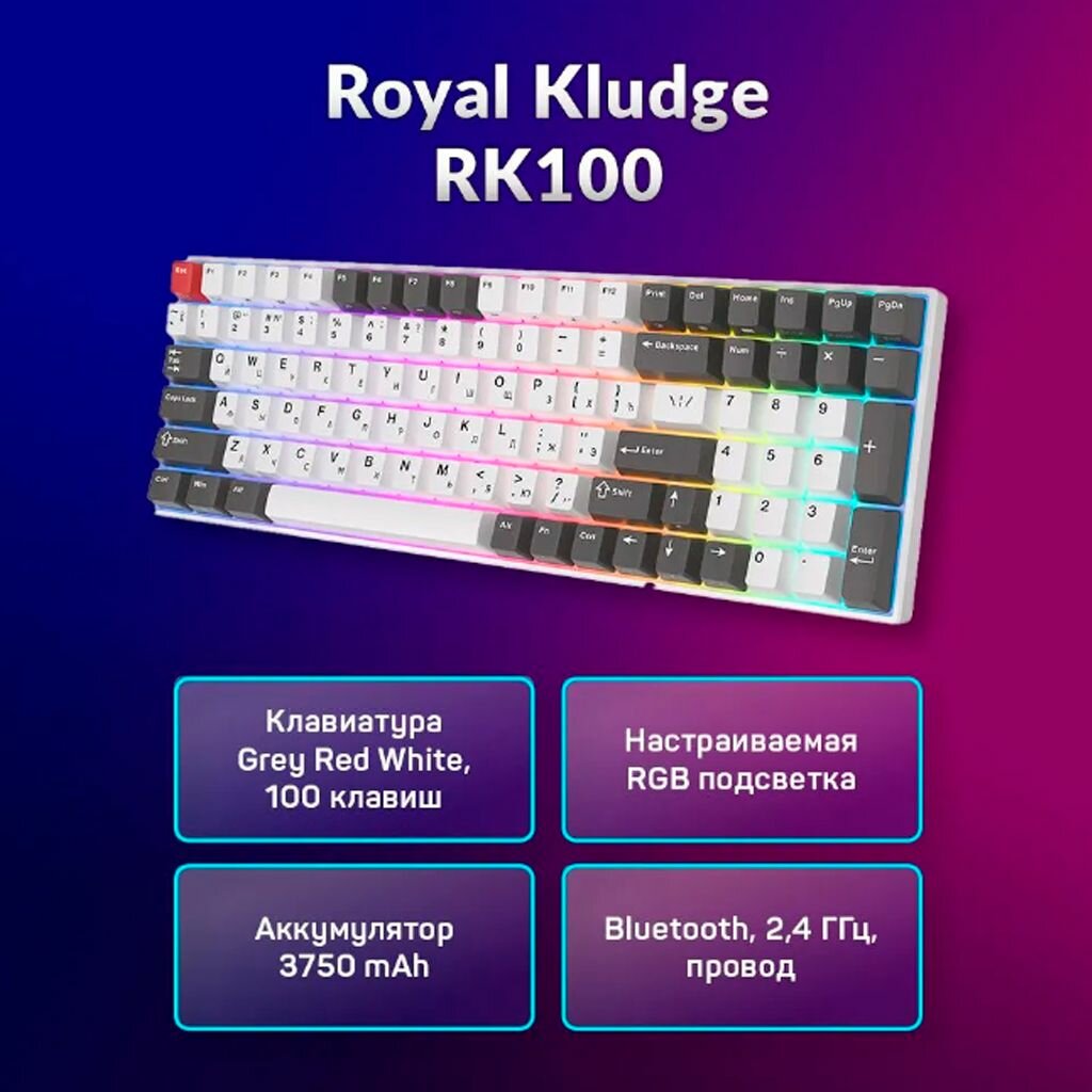 Игровая клавиатура Royal Kludge RK100 (USB/2.4 GHz/Bluetooth, RGB, Hot Swap, Red switch), белый/серый/красный
