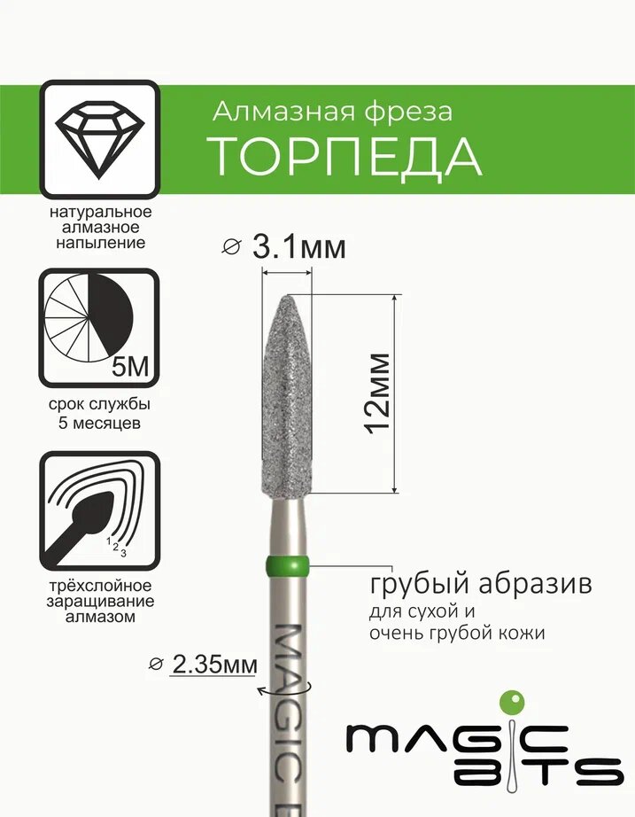 Magic Bits Фреза алмазная торпеда 3.1 мм с натуральным напылением грубого абразива интересное: