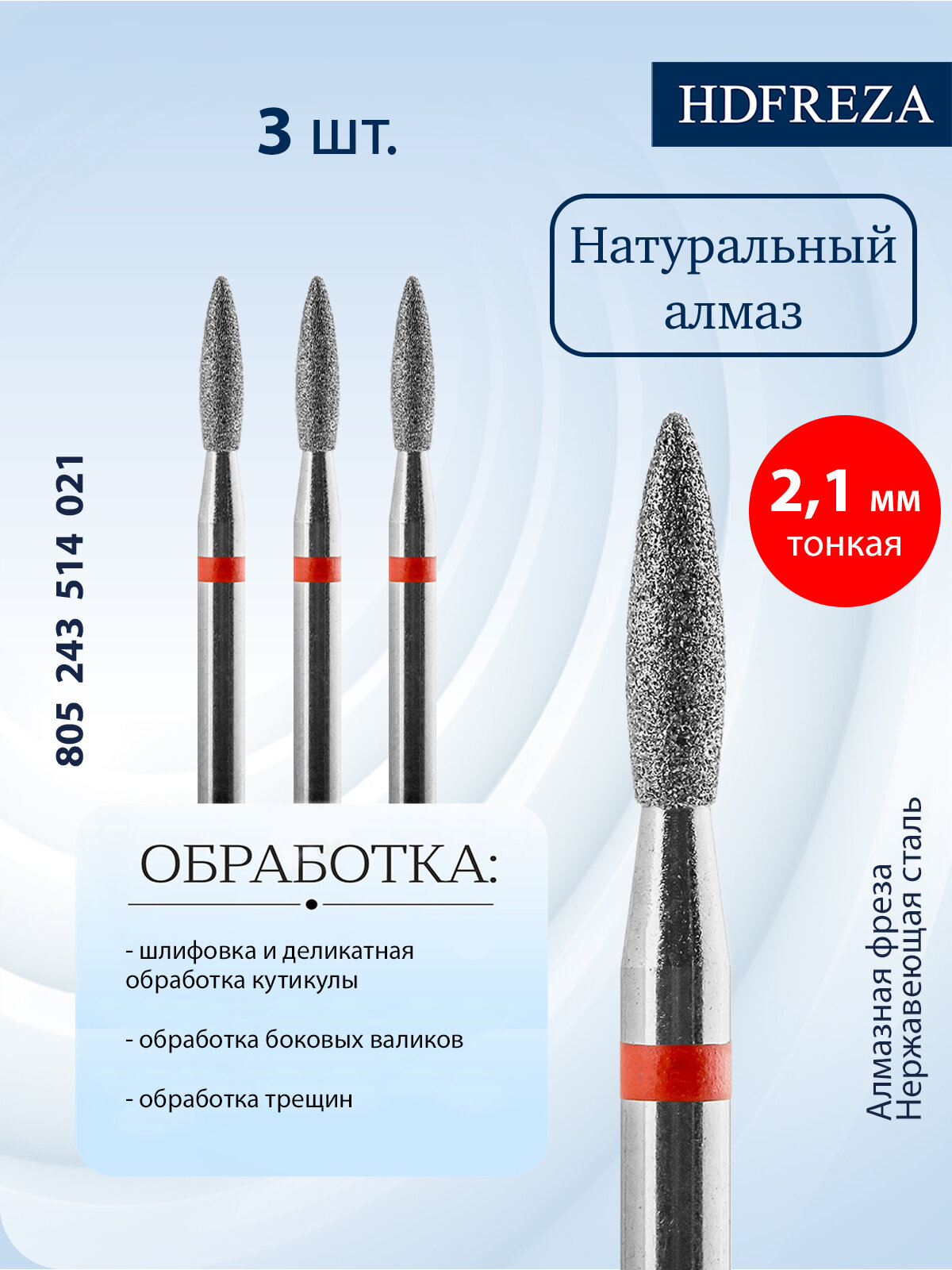 Фреза для маникюра и педикюра алмазная HDFREZA для кутикулы 805 243 514 021 Тонкая пламя (упаковка 3 шт) интересное: