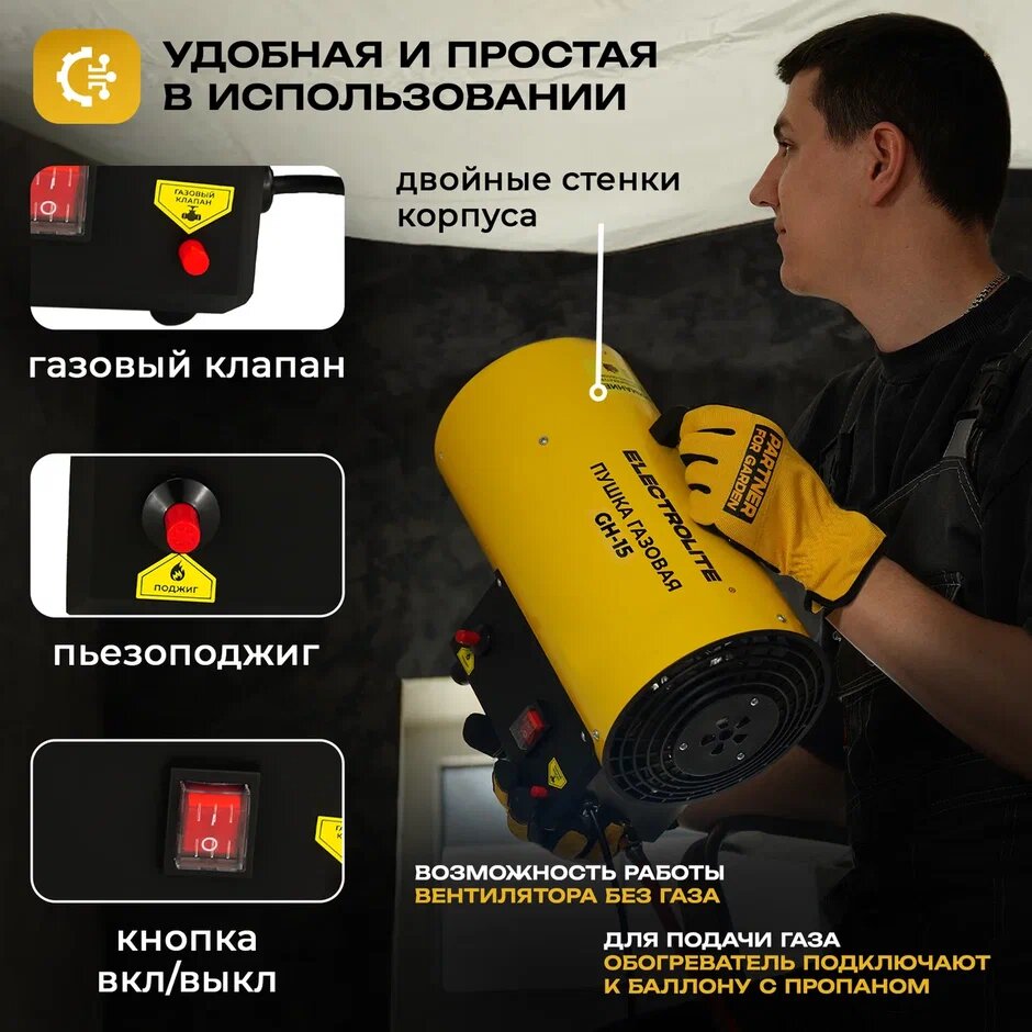 Тепловая пушка / газовая пушка / пушка газовая / тепловая пушка газовая ELECTROLITE GH-15 (15 кВт, 400 м3, пропан/бутан, обогрев до 150 м2) обогреватель150 м2) оробгреватель газовый