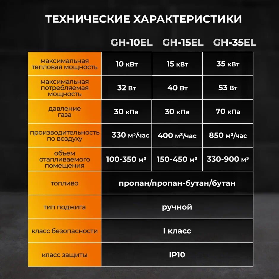 Тепловая пушка газовая ELECTROLITE GH-10 EL (10 кВт, 350 м3, пропан/бутан, нагрев до 100 м2) обогреватель газовый