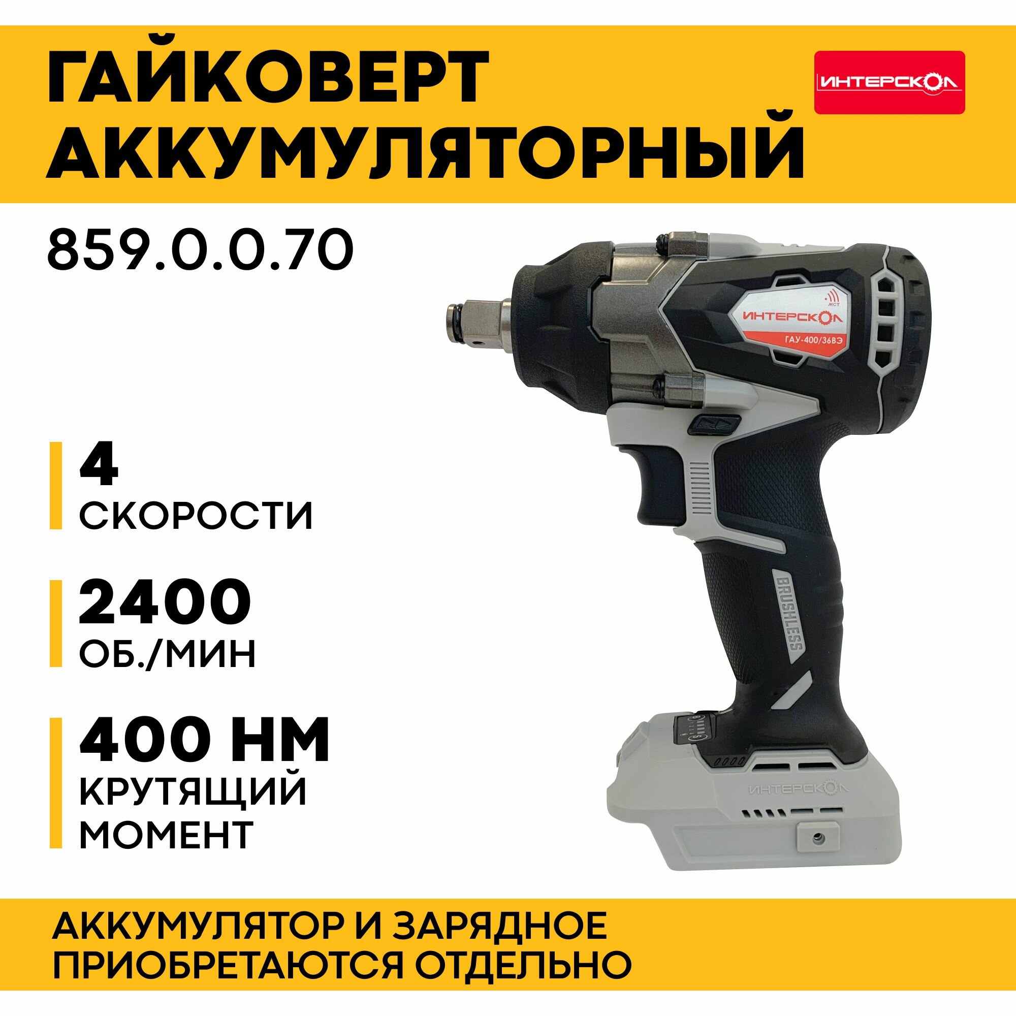 Гайковерт бесщеточный ИНТЕРСКОЛ ГАУ-400/36ВЭ АПИ, арт. 859.0.0.70