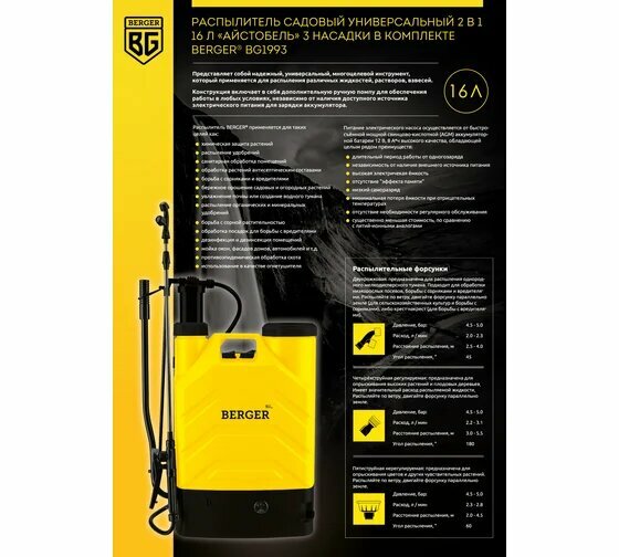 Распылитель садовый универсальный 2в1 16л айстобель (3 насадки в комплекте) BERGER BG1993 интересное: