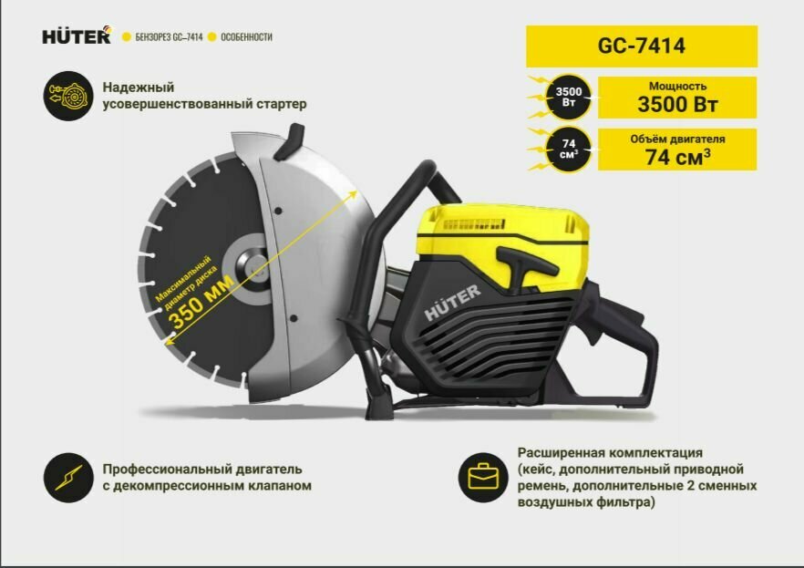 Ниже Вы можете прочитать отзывы на Бензорез Huter (GC-7414), ознакомится с подробными характеристиками, посмотреть интересные обзоры и фотографии на Бензорез Huter (GC-7414).