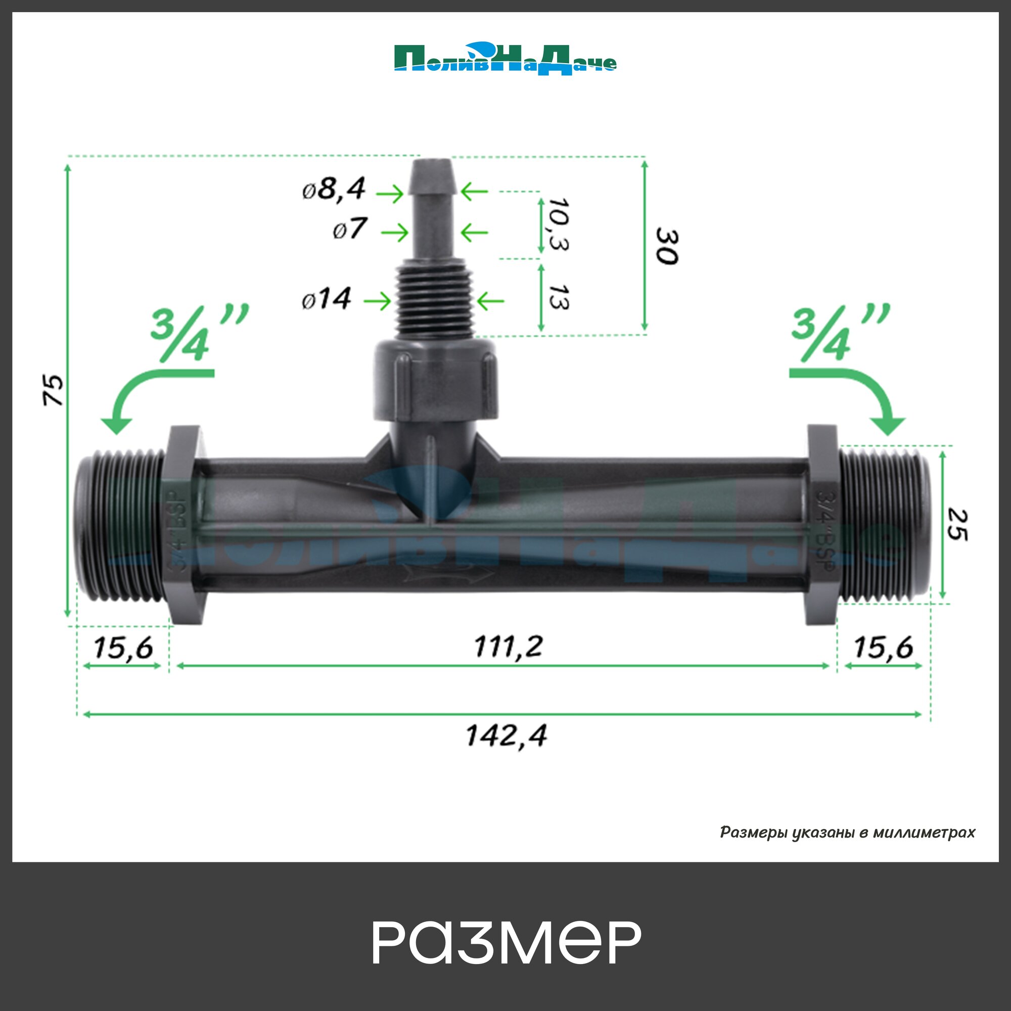 Инжектор Вентури для внесения удобрений 3/4" поток 0,65-2,42 м3/ч при 0,7-9,5 bar, мощность всасывания 9-92 л/ч