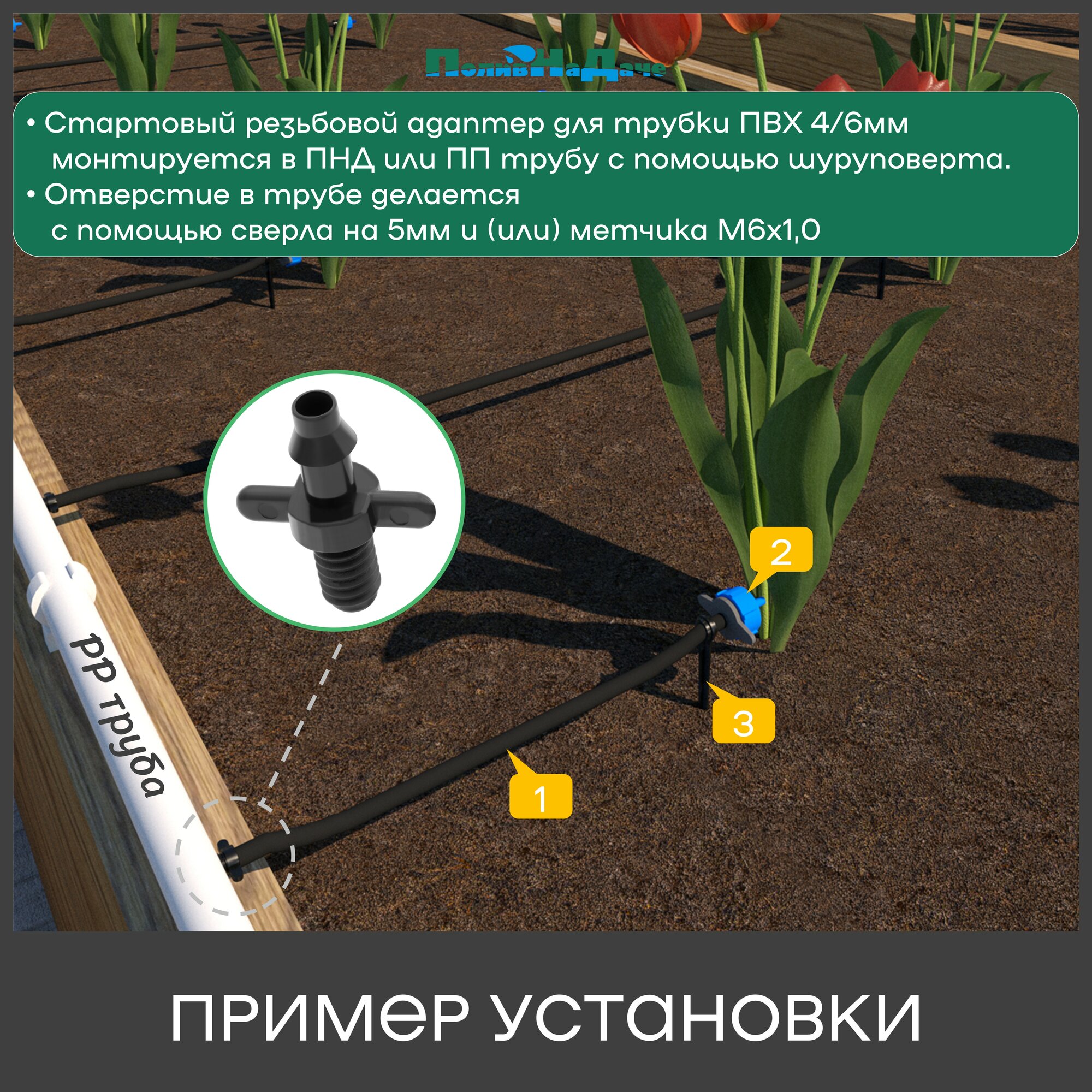 | Комплектация | Стартовый резьбовой адаптер для трубки ПВХ 4/6мм и 4/7мм (1/4 дюйма) |