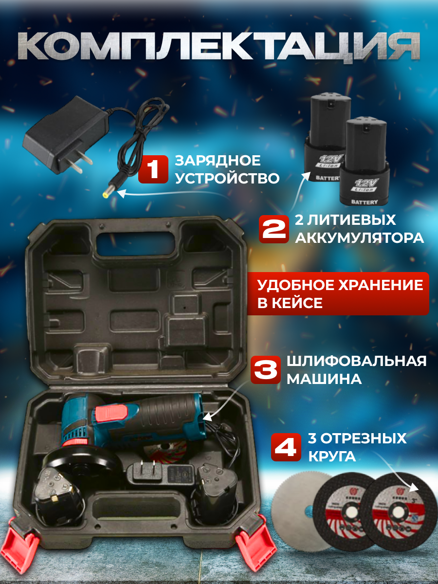 Купить Аккумуляторная УШМ (мини отрезная машина) 12В, диски 76 мм, 2 АКБ 1.5 А/ч, кейс