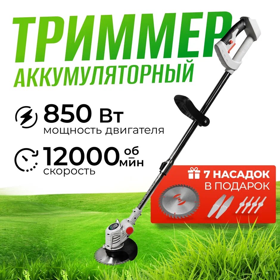 Триммер для травы аккумуляторный садовый ручной мощный триммер для газона. 2 аккумулятора. 8 насадок