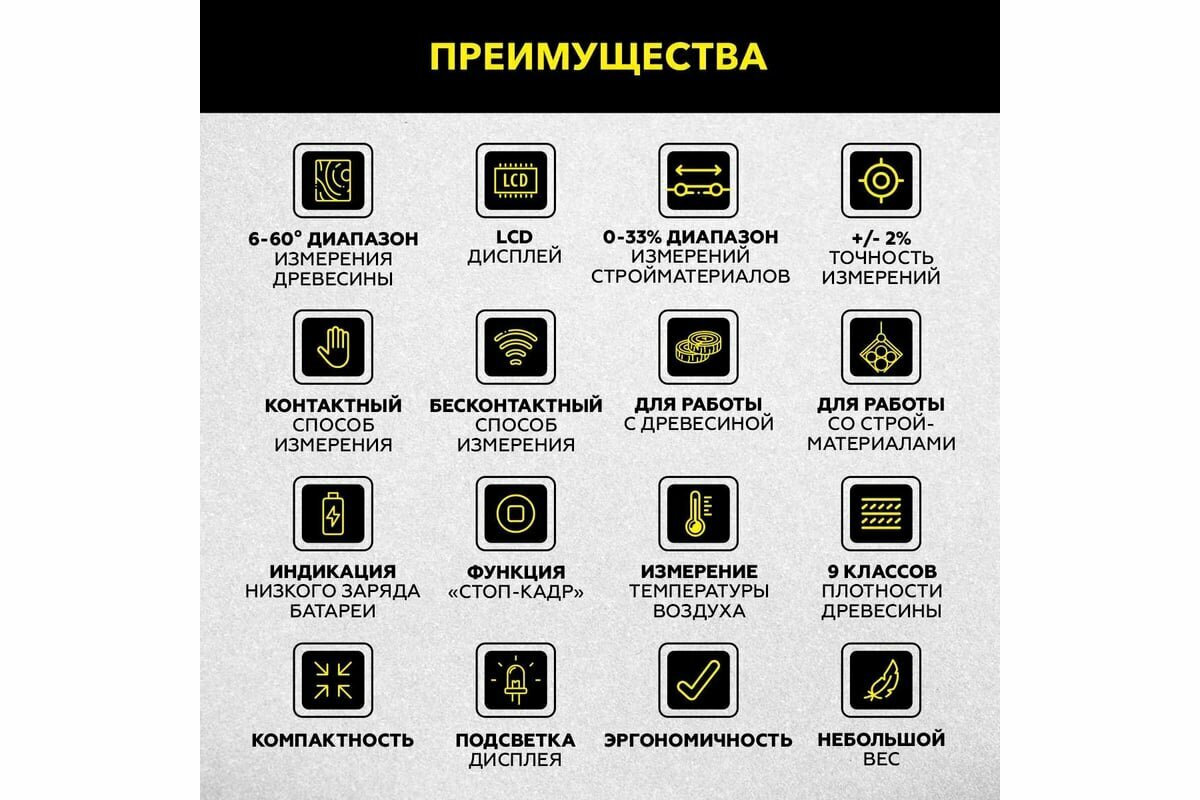 | Функции | измерение влажности воздуха / измерение влажности материалов / измерение температуры / индикатор разряда батарей / подсветка экрана / удержание текущего показания |