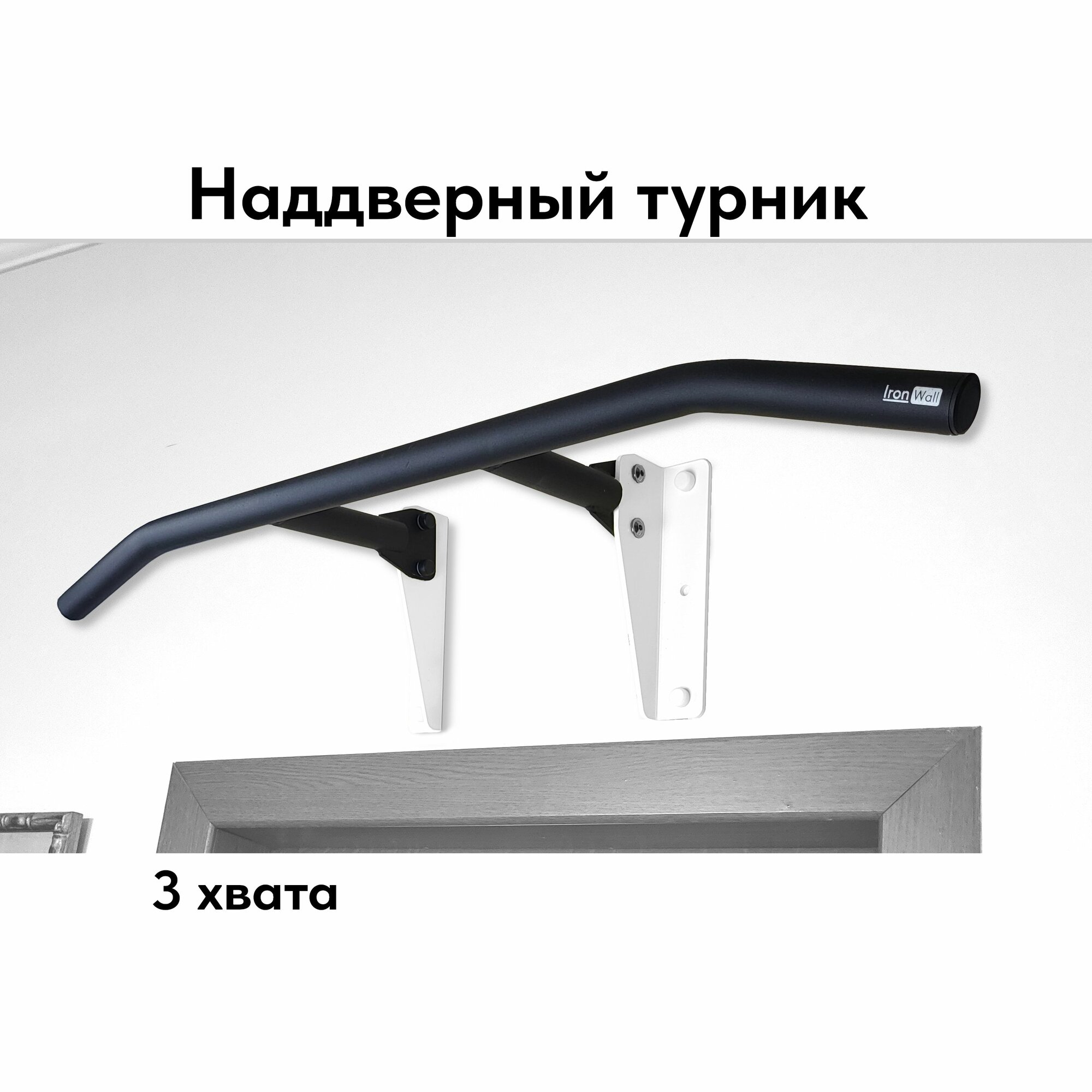 Турник наддверный IronWall PRO модель D1 4-00 c чёрной перекладиной для трех видов хвата и чёрными кронштейнами крепления к стене